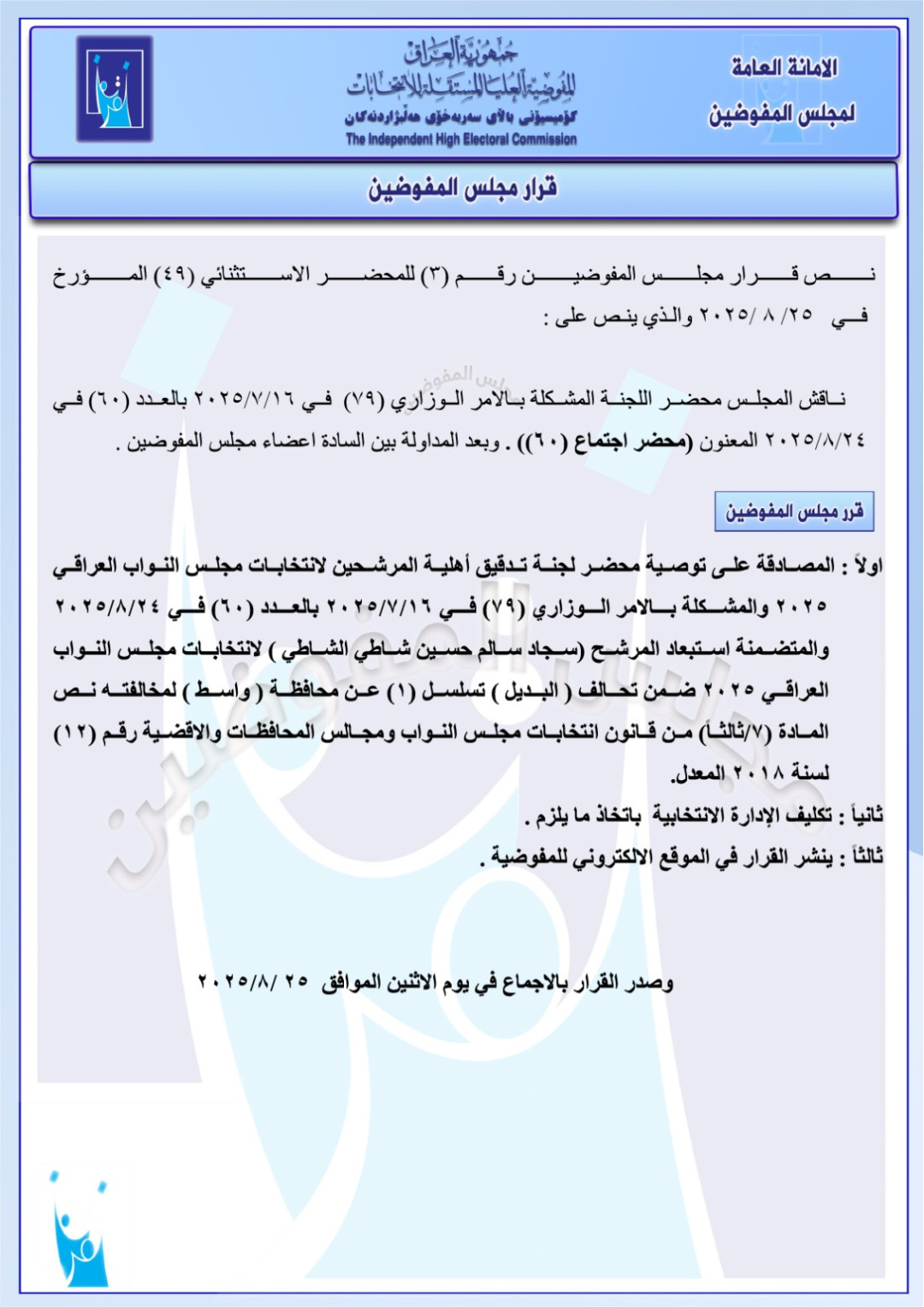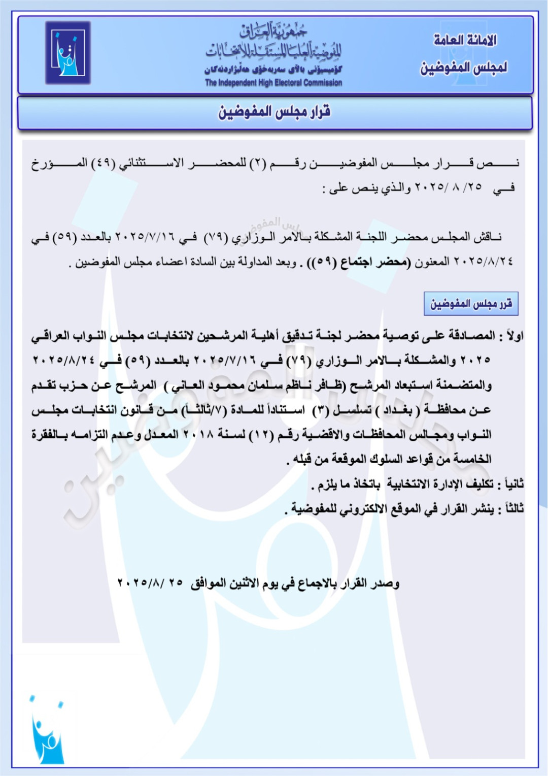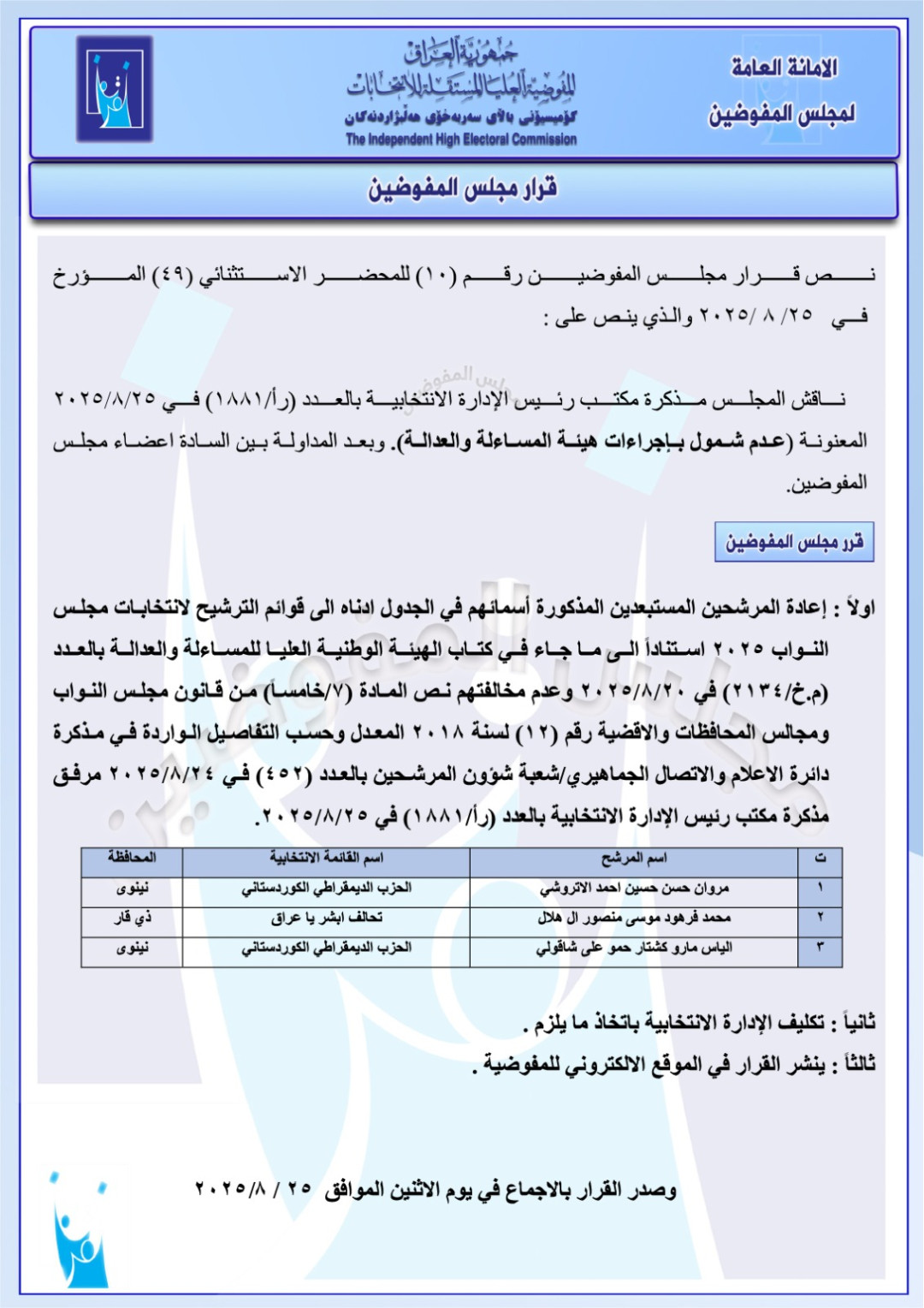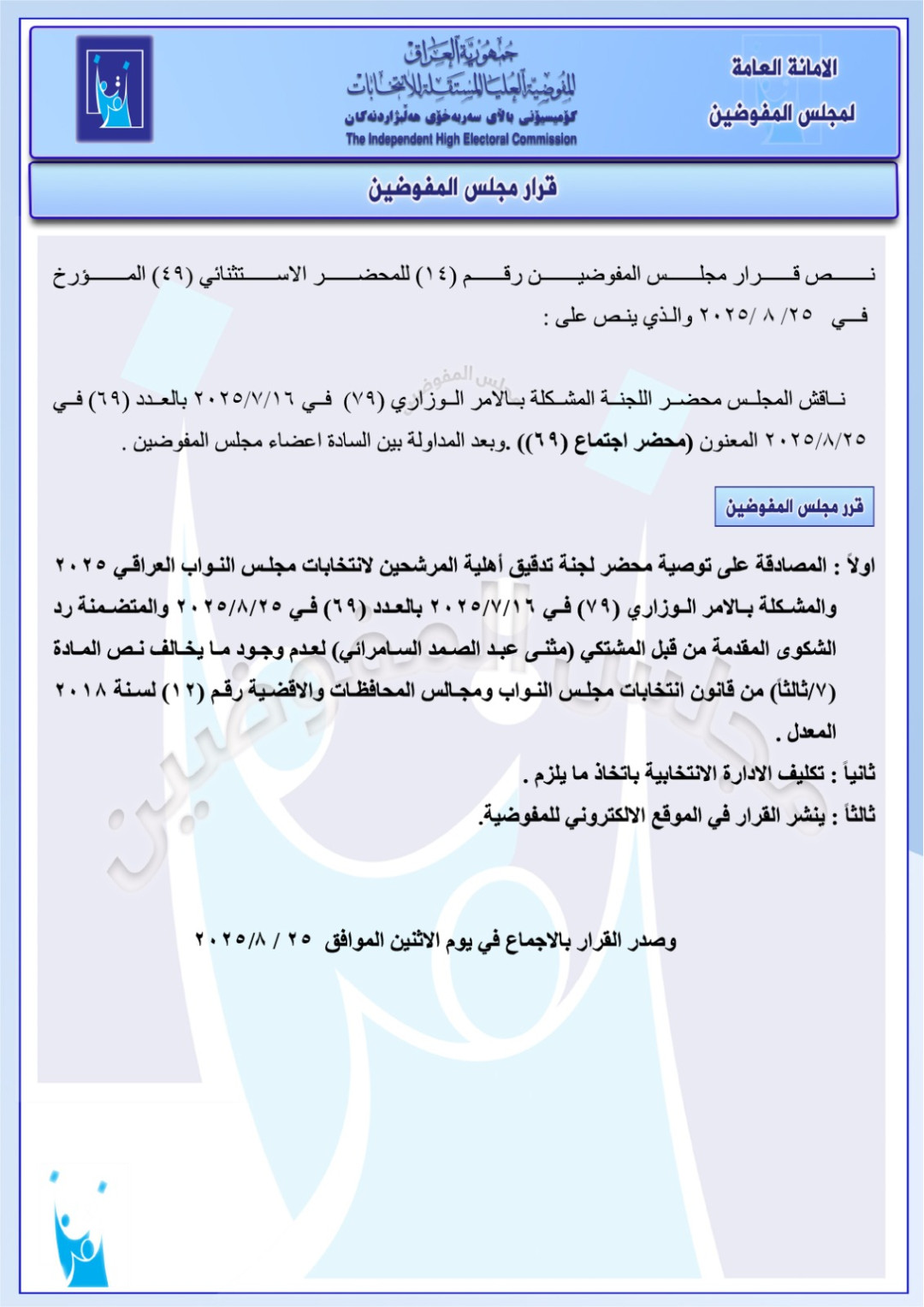 بغداد/ شبكة أخبار العراق- أعلنت المفوضية العليا المستقلة للانتخابات في العراق، اليوم، إعادة مرشحين مستبعدين إلى السباق الانتخابي فيما استبعدت آخرين لمخالفتهم قانون الانتخابات.وأشارت المفوضية في وثائق نشرت من قبلها، إلى أن قرار إعادة المرشحين بعد استبعادهم جاء “لعدم كفاية الأدلة الثبوتية”.وأظهرت الوثائق استبعاد المرشح ظافر العاني لعدم التزامه بقواعد السلوك، والمصادقة على استبعاد المرشح سجاد سالم لمخالفته المادة 7/ ثالثاً من قانون الانتخابات، والمصادقة على رد الشكوى المقدمة من مثنى السامرائي لعدم وجود ما يخالف المادة آنفاً.كما تضمنت أيضاً، الموافقة على التوصية برد الشكوى المقدمة من قبل هادي حسن السلامي لعدم كفاية الأدلة.