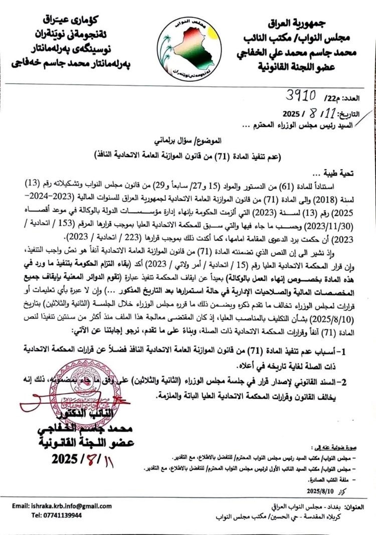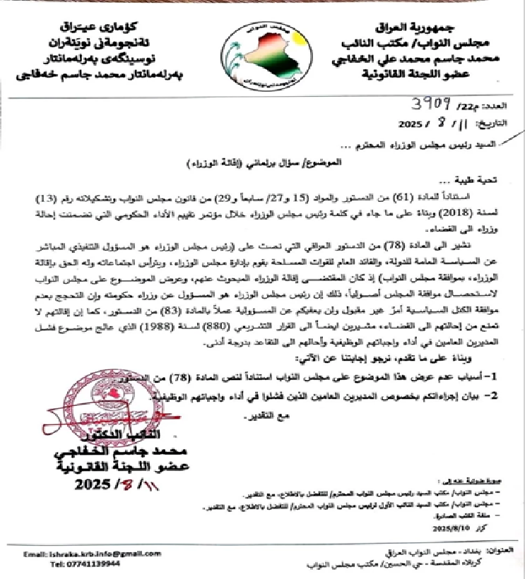 بغداد/ شبكة أخبار العراق- وجه النائب محمد الخفاجي أسئلة الى رئيس الوزراء محمد السوداني يطالب فيها عن سبب عدم إقالة الوزراء الفاسدين المحالين للقضاء وفق ما جاء بتصريح السوداني الأخير بشأن تقييم الوزراء والمدراء العامين ، وكما مبين أدناه…