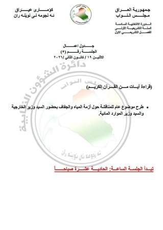 الرئيسيةسياسية الأثنين المقبل..البرلمان يناقش جفاف المياه آخر تحديث: 17 يناير 2026 - 9:35 ص بغداد/ شبكة أخبار العراق- يعقد مجلس النواب، جلسته الإثنين المقبل لمناقشة أزمة المياه والجفاف بحضور وزير الخارجية ووزير الموارد المائية وأدناه جدول الجلسة كما نشرته الدائرة الإعلامية للمجلس.