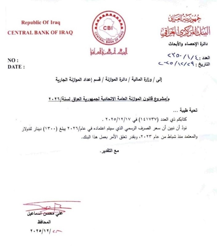 بغداد/ شبكة أخبار العراق- خاطب البنك المركزي العراقي، وزارة المالية بشأن سعر الصرف الرسمي للدولار المقرر اعتماده في مشروع قانون الموازنة العامة الاتحادية لعام 2026.وذكرت وثيقة صادرة عن البنك، أن “سعر الصرف الرسمي الذي سيتم اعتماده في عام 2026 يبلغ (1300) دينار للدولار الواحد”.وأوضحت الوثيقة أن “هذا السعر هو المعتمد منذ شهر شباط من عام 2023″، مشيرة إلى أن “تحديد السعر يأتي ضمن حدود اختصاص عمل البنك المركزي العراقي”.ويأتي اعلان البنك المركزي العراقي، تزامنا مع ارتفاع شهدته أسواق البورصة المحلية لبيع العملة الأجنبية حيث سجل الدولار اليوم الخميس، ( 8 كانون الثاني 2026 )، ببغداد 147.850 ديناراً لكل 100 دولار.