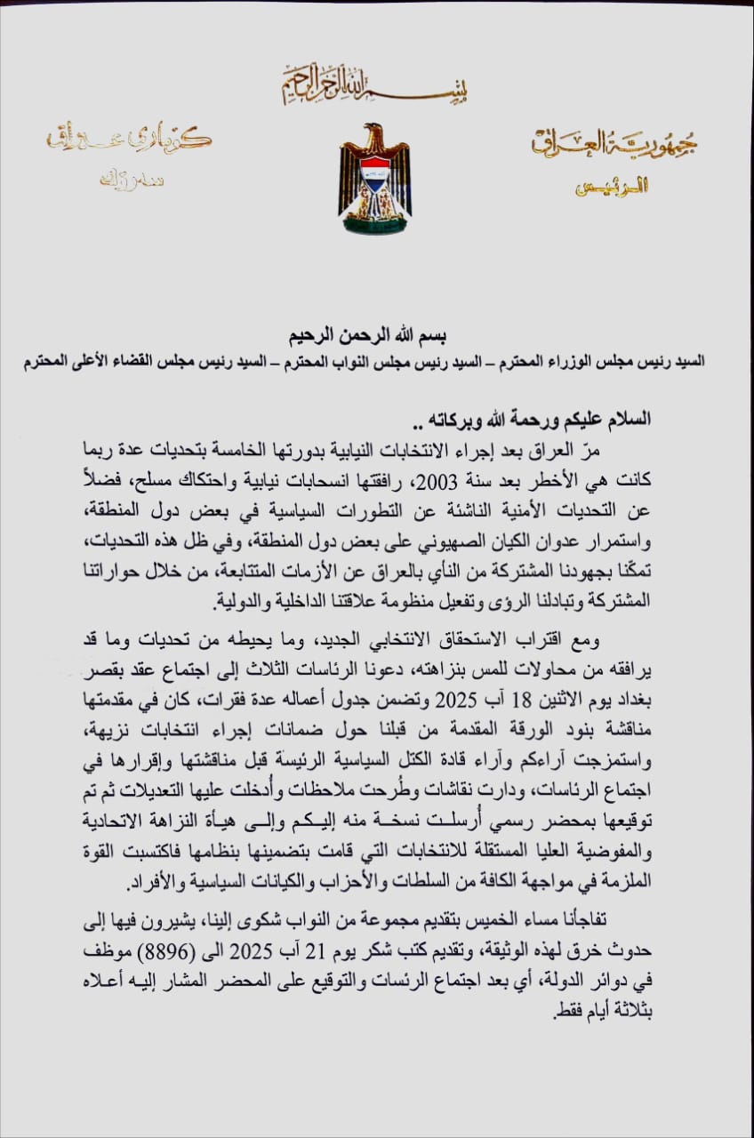 بغداد/ شبكة أخبار العراق- أبلغ رئيس الجمهورية عبد اللطيف جمال رشيد، اليوم الأحد، الرئاسات بشكاوي تقدم بها نواب الى رئيس الجمهورية تضمّنت خرقاً للوثيقة التي تم الاتفاق عليها في اجتماع الرئاسات لضمان النزاهة والشفافية في الانتخابات النيابية المقبلة.ووفقا لرسالة مُذيِّلة بتوقيع الرئيس رشيد، فإن الخرق تم “عبر منح كتب شكر الى آلاف الموظفين في دوائر الدولة بعد ثلاثة أيام من التوقيع على محضر الوثيقة الانتخابية بثلاثة أيام”.وذكر رئيس الجمهورية، “تفاجأنا مساء الخميس بتقديم مجموعة من النواب شكوى إلينا يشيرون فيها إلى حدوث خرق لهذه الوثيقة، وتقديم كتب شكر يوم 21 آب 2025 إلى 8896 موظفاً في دوائر الدولة، أي بعد اجتماع الرئاسات والتوقيع على محضر الرئاسات بثلاثة أيام فقط”.واتفقت الرئاسات العراقية الأربع (الجمهورية، ورئاسة الوزراء، ورئاسة مجلس النواب، ورئاسة مجلس القضاء الاعلى) يوم 18 من شهر آب/أغسطس الجاري على شروط “صارمة” تُلزم الوزراء والمسؤولين الحكوميين والأحزاب والمرشحين للانتخابات التشريعية المقبلة بعدة ضوابط لضمان نزاهة الانتخابات.