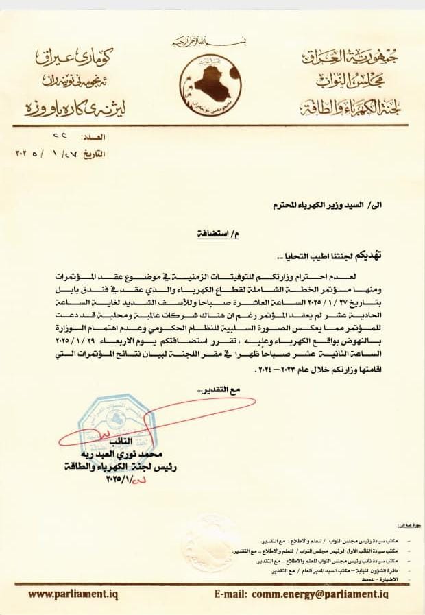 بغداد/ شبكة أخبار العراق- غادرت لجنة الكهرباء والطاقة النيابية المؤتمر الذي أقامته وزارة الكهرباء، الذي انعقد، صباح الاثنين، في فندق بابل للإعلان مشاريع جديدة.ووفقاً لوثيقة ، فإن اللجنة اعتبرت أن هذا الإجراء جاء على خلفية رغبتها في متابعة نتائج المؤتمرات السابقة للوزارة، وما تحقق منها على أرض الواقع.وأكدت اللجنة، بحسب الوثيقة، أنها حددت يوم الأربعاء المقبل، موعداً لاستضافة وزير الكهرباء زياد علي فاضل لفشله وفساده، في البرلمان لمساءلته حول مخرجات المؤتمرات السابقة ومدى تأثيرها على تحسين الواقع الكهربائي.وأعلن وزير الكهرباء العراقي زياد علي فاضل، صباح اليوم الاثنين، إطلاق مشاريع إنتاج جديدة بطاقة 15 ألف ميغاواط، فيما أكد رفع انتاج البلاد من الطاقة بنحو 9 آلاف ميغاواط خلال العاميين الماضيين.
