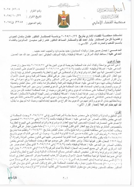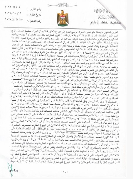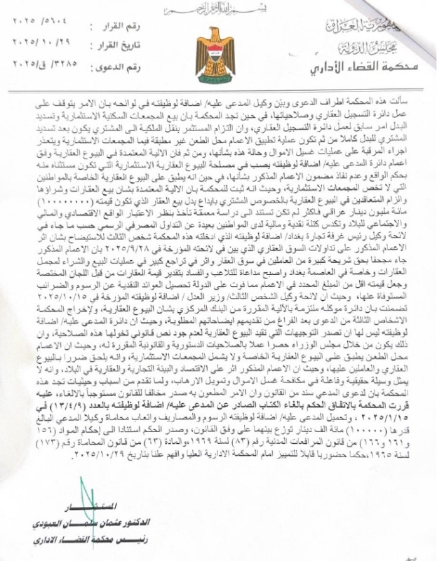 بغداد/ شبكة أخبار العراق- قررت محكمة القضاء الإداري، إبطال قرار البنك المركزي بشأن تقييد بيع العقارات والتحويلات المصرفية المرتبطة بها.وذكرت المحكمة في منطوق القرار وبحسب وثائق ، إنها “قررت إلغاء الكتاب الصادر عن محافظ البنك المركزي العراقي المؤرخ في 9/4/2025 والمتضمن تقييد التعاملات المصرفية الخاصة بعمليات البيع العقاري، واعتبار تلك القيود باطلة لمخالفتها أحكام القانون والدستور”.واضافت الوثائق “كما حمّلت المحكمة المدعى عليه إضافة لوظيفته الرسوم والمصاريف القانونية”، مؤكدةً أن “القرار قابل للتمييز أمام المحكمة الإدارية العليا وفق أحكام المواد (7) و(12) من قانون المحكمة الإدارية العليا رقم (17) لسنة 2013”.