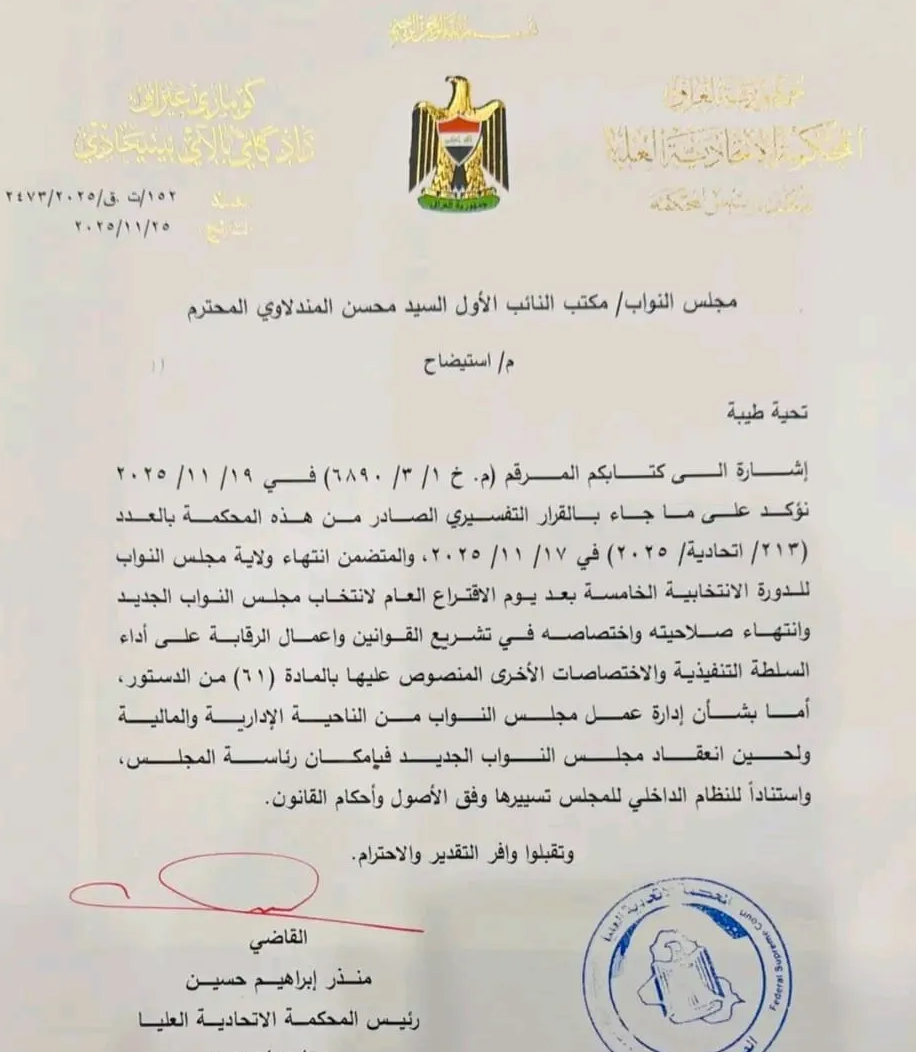 بغداد/ شبكة أخبار العراق- أصدرت المحكمة الاتحادية العليا، قراراً تفسيرياً أكدت فيه انتهاء ولاية مجلس النواب فور انتهاء يوم الاقتراع العام، وما يترتب على ذلك من توقف صلاحياته التشريعية والرقابية.وجاء توضيح المحكمة، بناءً على مخاطبة مجلس النواب، حيث أكدت أن مخاطبات مجلس النواب تقتصر بعد ذلك على الشؤون الإدارية والمالية فقط، إلى حين مباشرة المجلس الجديد مهامه الدستورية.وقررت المحكمة الاتحادية، يوم الاثنين من الأسبوع الماضي، إنهاء أعمال مجلس النواب وتحويل الحكومة إلى “حكومة تصريف أعمال”.وذكرت المحكمة في وثيقة، أن “يوم الاقتراع العام لانتخاب مجلس النواب الجديد يعني انتهاء ولاية مجلس النواب وانتهاء صلاحيته في سن القوانين وأعمال الرقابة على أداء السلطة التنفيذية من الناحية الفعلية، وتحول صلاحيات مجلس الوزراء من الصلاحية الكاملة إلى الصلاحية المحدودة في تصريف الأمور اليومية والمتمثلة باتخاذ القرارات والإجراءات غير القابلة للتأجيل”.