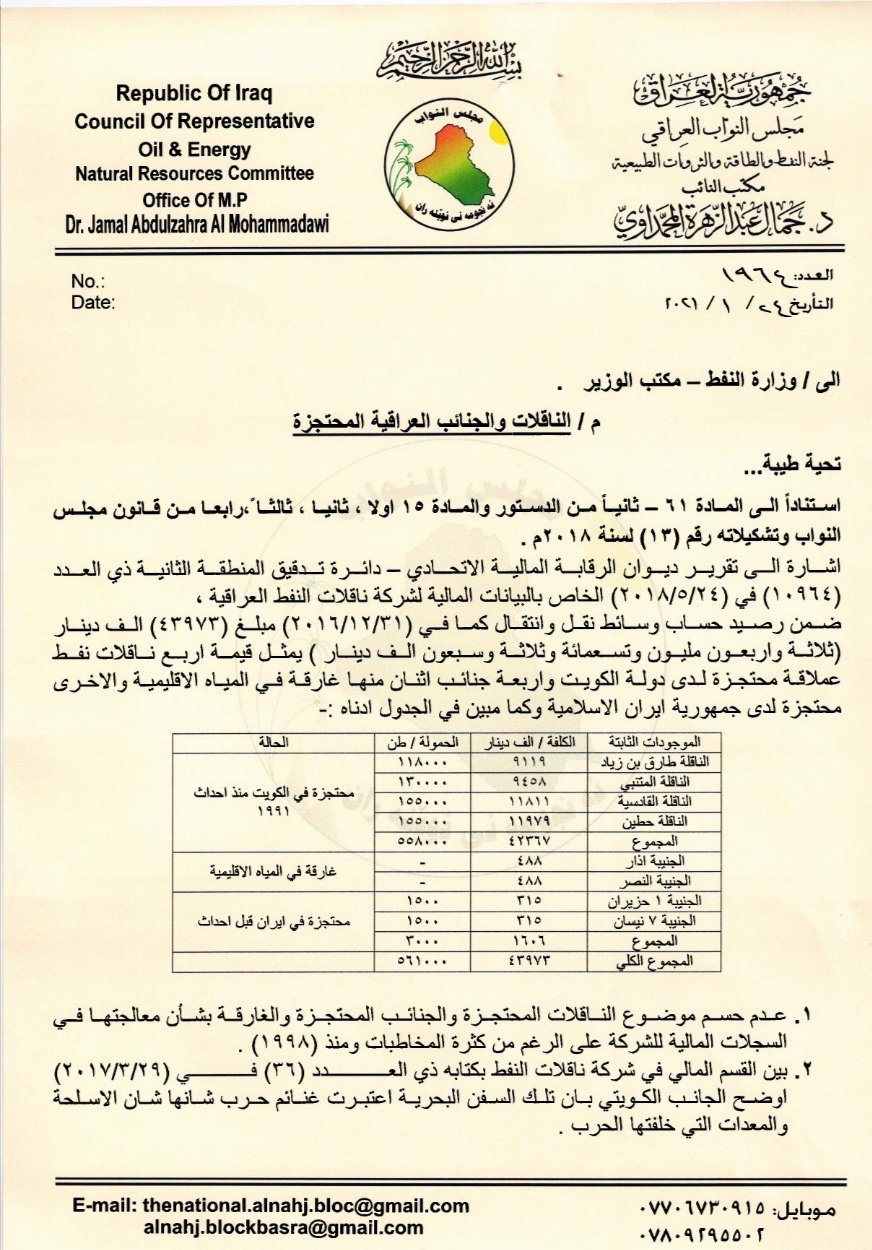 بغداد/شبكة أخبار العراق- دعا عضو لجنة الطاقة النيابية جمال المحمداوي، الثلاثاء، صندوق استرداد الأموال العراق التابع لمجلس الوزراء ووزارة النفط لبذل المزيد من الجهد لحسم مصير اربع ناقلات نفط عراقية محتجزة لدى الكويت واربعة جنائب بحرية اثنان منها غارقة في المياه الاقليمية والاخرى محتجزة لدى ايران.وقالت وثيقة صادرة من مكتب النائب جمال المحمداوي بتاريخ ٢٤ /١ /٢٠٢١  “اشارة الى تقرير ديوان الرقابة المالية الاتحادي  في (٢٤ /٥ / ٢٠١٨) الخاص بالبيانات المالية لشركة ناقلات النفط العراقية ,ضمن رصيد حساب وسائط نقل وانتقال كما في الكتاب المؤرخ في (٣١ /١٢ / ٢٠١٦ ) مبلغ (ثلاثة واربعون مليون وتسعمائة وثلاثة وسبعون الف دينار ) في (تسعينيات القرن الماضي) يمثل قيمة اربع ناقلات نفط عملاقة محتجزة لدى دولة الكويت واربعة جنائب اثنان منها غارقة في المياه الاقليمية والاخرى محتجزة لدى جمهورية ايران الاسلامية “.وبينت الوثيقة أن الناقلات ” هي الناقلة طارق بن زياد و الناقلة المتنبي والناقلة القادسية والناقلة حطين محتجزات في الكويت منذ احداث ١٩٩١”،واضافت ان “الجنيبة ١ حزيران والجنيبة ٧ نيسان محتجزة في ايران قبل أحداث ١٩٩١، وان الجنيبة النصر وآذار غارقة في المياه الإقليمية”.واكد المحمداوي ان “عدم حسم موضوع الناقلات المحتجزة والجنائب المحتجزة والغارقة بشأن معالجتها في السجلات المالية للشركة على الرغم من كثرة المخاطبات ومنذ (١٩٩٨)”.بين القسم المالي في شركة ناقلات النفط بكتابه ذي العدد (٣٦) في (٢٩ / ٣ /٢٠١٧) اوضح الجانب الكويتي بان تلك السفن البحرية اعتبرت غنائم حرب شانها شان الاسلحة والمعدات التي خلفتها الحرب” .وأشار الى انه”خلال مقارنة ديوان الرقابة المالية الاتحادي لـ مجموع ناقلات الشركة الحالية البالغ عددها (٤) مع مجموع حمولات الناقلات المحتجزة لاحظ الديوان ضآلة النسبة حيث بلغت (٩%) الامر يشير الى ان الشركة فقدت (٩١%) من طاقاتها التي كانت متاحة لها من ناقلاتها المملوكة قبل احتجاز تلك الناقلات “.وبين أن” إجابة وزارة النفط  بتاريخ ٢٣ / ٢ /٢٠٢١ تشير إلى أن توقف العمل باللجنة الخاصة بموضوع الناقلات المحتجزة في الكويت وايران كان بسبب توجيه من صندوق استرداد أموال العراق التابع لمجلس الوزراء والمتضمن ايقاف عمل اي لجنة أو فريق أو وفد مشكل لأهداف مماثلة لأهداف الصندوق”.ودعا المحمداوي صندوق استرداد أموال العراق الى بذل المزيد من الجهود فيما يخص الناقلات والجنائب المحتجزة من خلال مفاتحة الجهات المعنية لما لها من الاثر الكبير على نشاط الشركة ورفد الاقتصادي الوطني .
