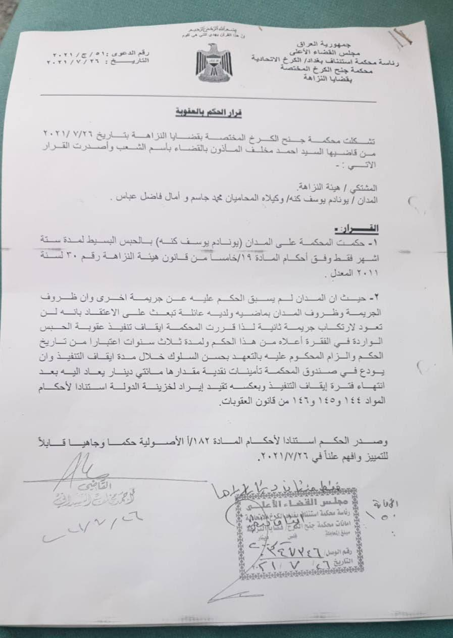 بغداد/ شبكة أخبار العراق- اعلنت هيئة النزاهة، الاثنين، الحكم على النائب يونادم كنا بالحبس 6 اشهر مع إيقاف التنفيذ. بحسب وثائق حصل عليها “ناس” (30 اب 2021)، فان “محكمة جنح الكرخ المختصة بقضايا النزاهة حكمت بالحبس البسيط ستة اشهر وفق المادة 19/ خامساً من قانون هيئة النزاهة”. واشارت الوثائق الى ان “المدان لم يسبق الحكم عليه سابقاً عن جريمة اخرى وان ظروف الجريمة وظروف المدان بماضيه ولديه عائلة.. قررت المحكمة إيقاف تنفيذ الحكم لمدة 3 سنوات والتعهد بحسن السلوك”. .