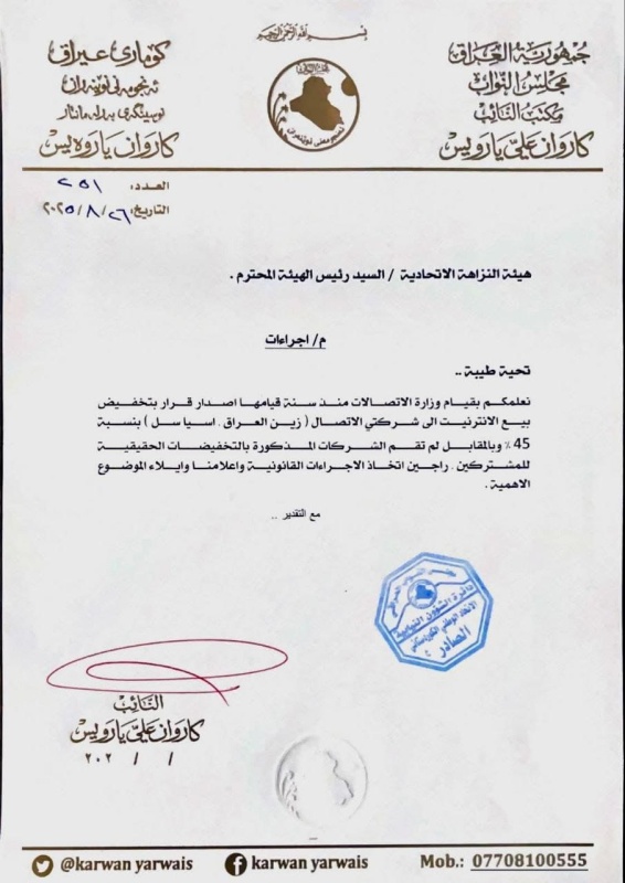 بغداد/ شبكة أخبار العراق- أظهرت وثيقة صادرة عن مكتب النائب كاروان ياروايس،أمس الثلاثاء (2 أيلول 2025)، توجيه كتاب رسمي إلى هيئة النزاهة الاتحادية بشأن قيام وزارة الاتصالات ببيع خدمة الإنترنت لشركتي “زين العراق” و”آسياسيل” بخصم يصل إلى 45% خلافًا للسياقات القانونية.وأكد ياروايس في مخاطبته أن القضية تستدعي اتخاذ الإجراءات القانونية اللازمة والتحقيق في تفاصيلها، لما لها من أهمية ترتبط بالمال العام وشفافية التعاملات.
