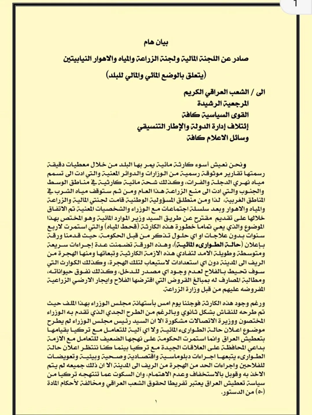بغداد/ شبكة أخبار العراق- انتقد بيان برلماني،الخميس،نهج الحكومة في التعامل مع الأزمة المائية وعدم إعلان “حالة الطوارئ المائية” لتفادي “الأزمة الكارثية”، والسكوت عما تنتهجه تركيا بـ”تعطيش العراق”، بحسب تعبيرات البيان.ودعا البيان إلى عقد جلسة طارئة لمجلس النواب لاتخاذ القرارات اللازمة بموضوع “قحط المياه” بحضور رئيس الوزراء والوزراء المعنيين والمختصين، وإلزام مجلس النواب الحكومة بإعلان “حالة الطوارئ المائية”.كما طالبت اللجنتان، بتوضيح أسباب “منع” رئيس مجلس الوزراء، وزيرة المالية، من الحضور إلى لجان مجلس النواب إلا بعد استحصال موافقة منه، في وقت تعاني البلاد من مشكلة “شحة مالية”.ووجهت اللجنتان بيانهما المشترك إلى “الشعب، والمرجعية الدينية، والقوى السياسية كافة، وائتلاف إدارة الدولة والإطار التنسيقي، ووسائل الإعلام كافة”.وصدر البيان المشترك من رئيس اللجنة المالية يوسف الكلابي ورئيس لجنة الزراعة والمياه والأهوار فالح الخزعلي.