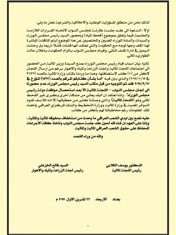 بيان برلماني يحمل السوداني مسؤولية شحة المياه والعجز المالي في العراق