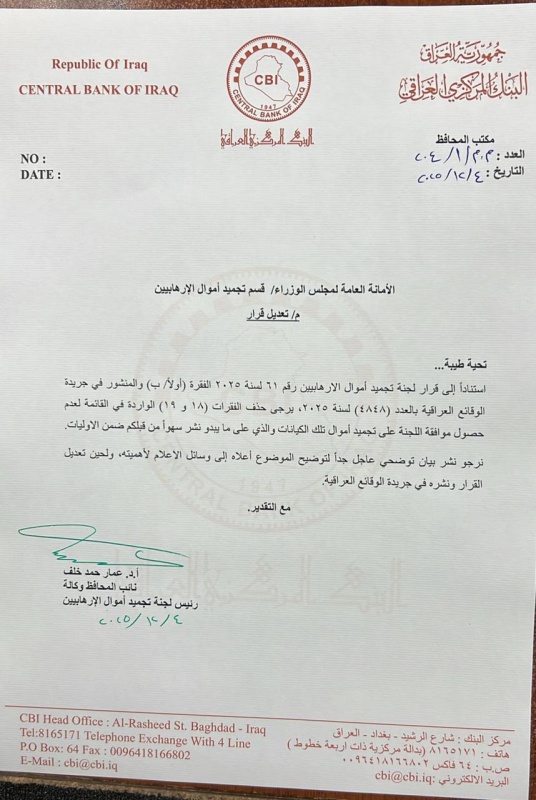 بغداد/ شبكة أخبار العراق- أصدرت لجنة تجميد أموال الإرهابيين في البنك المركزي العراقي، اليوم الخميس (4 كانون الأول 2025)، بياناً توضيحياً بشأن قرارها رقم 61 لسنة 2025 المنشور في جريدة الوقائع العراقية بالعدد 4848 بتاريخ 17/11/2025، والمتعلق بتجميد الأموال والأصول المرتبطة بعدد من الكيانات والأشخاص بناءً على طلب من دولة ماليزيا ووفق قرار مجلس الأمن الدولي رقم 1373 لسنة 2001.وأكدت اللجنة في بيانها،أن الموافقة العراقية انحصرت حصراً بالأسماء والكيانات المرتبطة بتنظيمي داعش والقاعدة، وأن إدراج كيانات أخرى في القائمة لم يكن جزءاً من قرارها، بل جاء نتيجة نشر القائمة قبل إتمام عمليات التنقيح. وأشارت إلى أنه سيتم تصحيح ما ورد في الوقائع العراقية عبر رفع تلك الأحزاب والكيانات التي لا علاقة لها بالتنظيمين الإرهابيين من السجل المنشور.وكانت جريدة الوقائع العراقية قد نشرت قائمة تضمنت إدراج جماعة أنصار الله (الحوثيين) وحزب الله ضمن الكيانات المصنّفة على صلة بالإرهاب، قبل أن تتراجع اللجنة عن التصنيف وتوضح أنه نُشر بطريق الخطأ وسيُعدّل رسمياً.وفي ختام البيان، أرفقت اللجنة وثيقة رسمية تؤكد إجراءات التصحيح ورفع الكيانات غير المعنية من السجل.