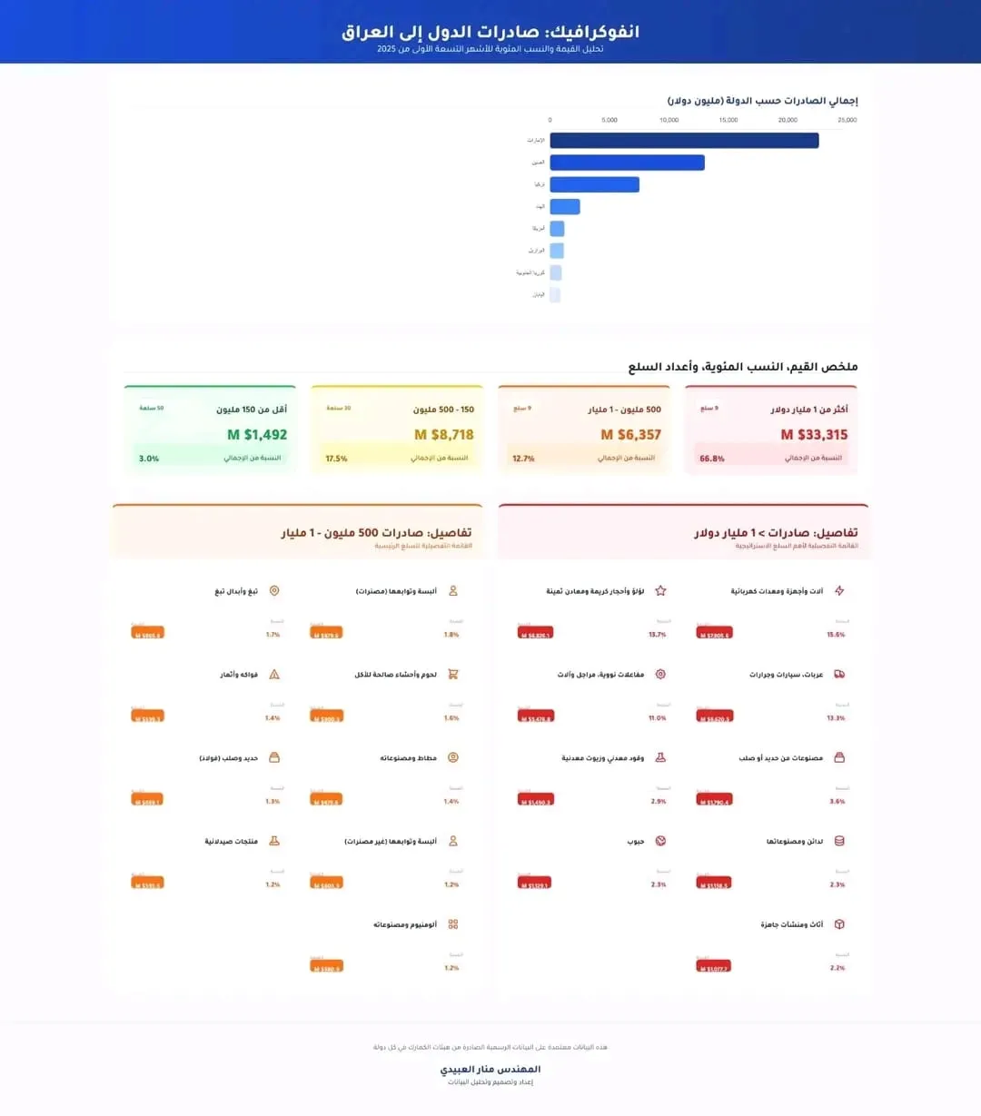 بغداد/شبكة أخبار العراق- أعلن الخبير الاقتصادي منار العبيدي، اليوم الأحد، بيانات الأشهر التسعة الأولى من العام أظهرت استمرار معدلات النمو في استيرادات العراق، مع بروز نمط واضح يتمثل في تركّز الاستيراد من عدد محدود من الدول، حيث تصدّرت كل من: الإمارات والصين وتركيا قائمة الدول الأكثر تصديرًا إلى البلاد.وفي الوقت نفسه، كشفت البيانات عن تركّز كبير في الفئات السلعية المستوردة، إذ إن 9 فئات سلعية فقط من أصل 99 فئة معتمدة عالميًا استحوذت على أكثر من 67% من إجمالي قيمة الاستيرادات العراقية، وفقا للعبيدي.وقد جاءت الأجهزة والمعدات الإلكترونية والكهربائية في المرتبة الأولى، تلتها المعادن الثمينة وعلى رأسها الذهب، ثم السيارات ومعداتها، وصولًا إلى الأجهزة الميكانيكية، وبشكل خاص أجهزة التبريد.ونوه الى العبيدي الى أنه انطلاقًا من هذه المؤشرات، يمكن تشخيص ثلاثة تحديات أساسية تواجه التجارة الدولية للعراق: أولًا: العجز المزمن في الميزان التجاري، ويعاني العراق من عجز كبير في ميزانه التجاري مع معظم الدول، باستثناء صادرات النفط، حيث يميل الميزان التجاري بنسبة تقارب 100% لصالح الدول المصدّرة.وأوضح أن هذا الواقع يستدعي تبنّي سياسة أكثر فاعلية في إدارة التجارة الخارجية، تقوم على تعزيز مبدأ المعاملة بالمثل والضغط باتجاه فتح الأسواق أمام السلع العراقية، سواء عبر حوافز تجارية أو اتفاقيات ثنائية أكثر توازنًا.