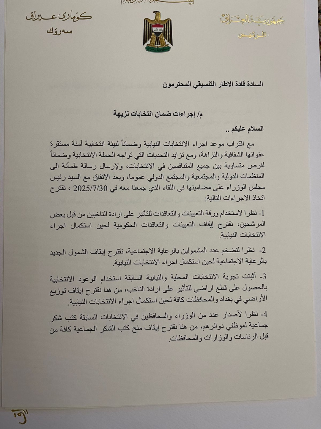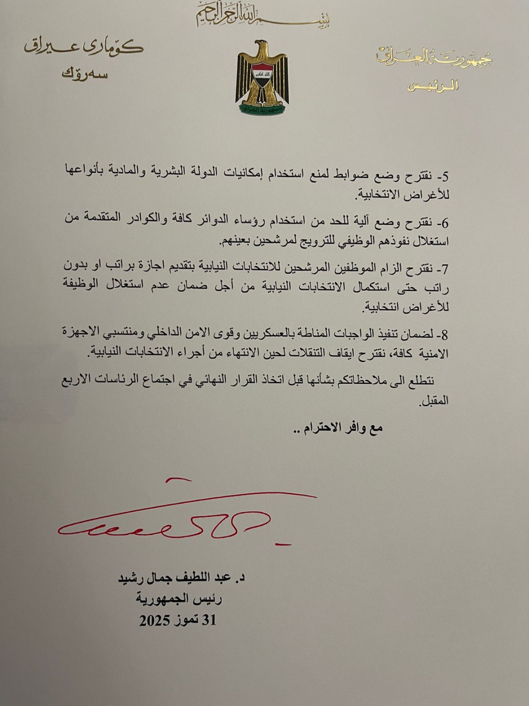 بغداد/ شبكة أخبار العراق- قدم رئيس الجمهورية عبد اللطيف رشيد ،اليوم الثلاثاء، عدة مقترحات تسبق موعد الانتخابات من ضمنها إيقاف التعيينات والتنقلات وعدم استغلال موارد الدولة للدعاية الانتخابية وغيرها كما ورد أدناه:- أدناه:-