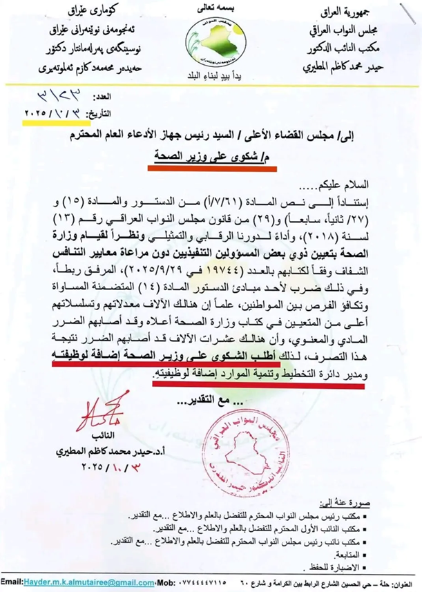 بغداد/ شبكة أخبار العراق- قدم النائب حيدر المطيري، اليوم الاثنين، شكوى رسمية إلى مجلس القضاء الأعلى، ضد وزير الصحة ومدير دائرة التخطيط وتنمية الموارد في الوزارة، وذلك على خلفية تعيين ذوي بعض المسؤولين التنفيذيين دون مراعاة معايير التنافس والشفافية.ووفقاً لوثيقة، فإنه “استنادا إلى نص المادة (61/سابعاً/ب) من الدستور والمادة (15) و(27/ثانياً/سابعاً/ج) من قانون مجلس النواب العراقي رقم (13) لسنة 2018 وأداء دورنا الرقابي والتمثيلي، ونظراً لقيام وزارة الصحة بتعيين ذوي بعض المسؤولين التنفيذيين دون مراعاة معايير التنافس والشفافية وفقاً لكتابها ذي العدد (19794) في 2025/9/29 المرفق ربطاً”.وأكد المطيري، بحسب الوثيقة، أن “ذلك ضرب لمبدأ العدالة والمساواة التي تضمنتها المادة (14) من الدستور بين المواطنين، لذلك أطلب الشكوى على وزير الصحة ومدير دائرة التخطيط وتنمية الموارد إضافة لوظيفتيهما”.وكانت نقابة أطباء الأسنان في العراق، أصدرت في 30 أيلول/ سبتمبر الماضي، بياناً أكدت فيه رفضها لتعيينات جديدة في وزارة الصحة تمت بناءً على “اعتبارات شخصية ومحسوبيات لا تمتّ إلى السياقات الرسمية بصلة”، مؤكدة أنها تحتفظ بحقها القانوني الكامل في اللجوء إلى كافة الإجراءات القضائية لحماية حقوق خريجي طب الأسنان ومنع تكرار مثل هذه التجاوزات. يذكر ان الحسناوي من افسد وزراء الصحة منذ ان كان وزيرا لها في حكومة المالكي الاولى.