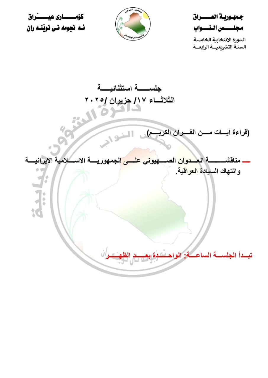 بغداد/ شبكة أخبار العراق- أعلن مجلس النواب العراقي، يوم الأحد، عن عقد جلسة استثنائية يوم الثلاثاء المقبل (17 حزيران/ يونيو الجاري).وبحسب وثيقة للدائرة الإعلامية للمجلس ، فإن الجلسة هي لمناقشة “العدوان الصهيوني على الجمهورية الإسلامية الإيرانية وانتهاك السيادة العراقية”.فيما أشارت إلى أن الجلسة تبدأ الساعة الواحدة بعد الظهر.يذكر ان طلب عقد الجلسة جاء من نواب أحزاب الحشد الشعبي الإيراني وبدعم من النائب الأول لرئيس البرلمان الإيراني الأصل المدعو محسن علي أكبر ولايتي.