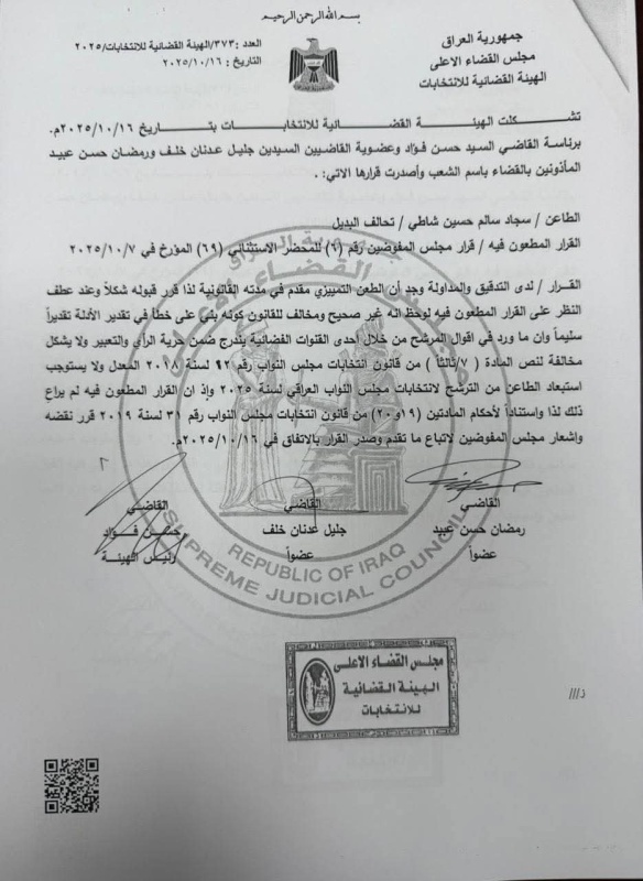 بغداد/ شبكة أخبار العراق- أعلنت الهيئة القضائية للانتخابات، اليوم الخميس (16 تشرين الأول 2025)، إعادة المرشح سجاد سالم إلى السباق الانتخابي.وبحسب وثيقة للهيئة القضائية، فإن “الهيئة القضائية المشرفة قررت إعادة المرشح سجاد سالم إلى السباق الانتخابي، بعد النظر في الطعون المقدمة ووفقاً للسياقات القانونية المعتمدة”.