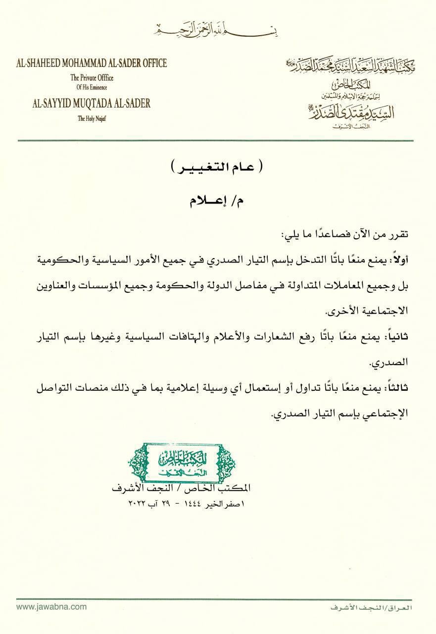 بغداد/ شبكة أخبار العراق- أصدر المكتب الخاص لزعيم التيار الصدري مقتدى الصدر، اليوم الاثنين، ثلاثة توجيهات، من بينها منع التدخل باسم التيار الصدري في جميع الأمور السياسية والحكومية.يذكر ان الصدر مريض نفسيا فهو يعاني من المزاجية الحادة في قراراته وانسحابه هذا يمثل المرة الرابعة وبعد 3 أشهر سيعود للعمل السياسي علما ان اتباعه ما زالوا في المناصب الحكومية بل سيشتركون في الحكومة القادمة.