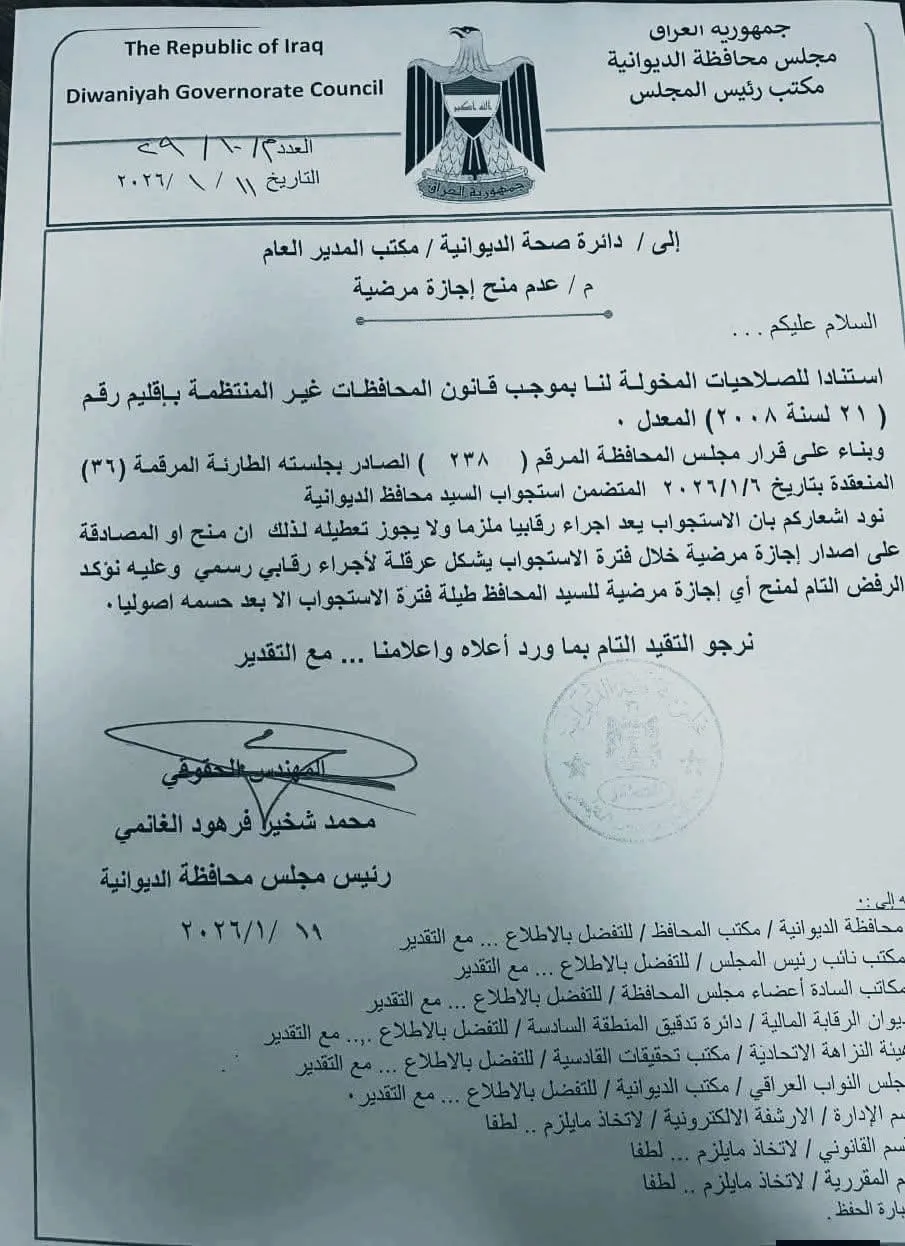 بغداد/ شبكة أخبار العراق- وجّه رئيس مجلس محافظة الديوانية، امس الأحد، كتاباً رسمياً إلى دائرة صحة المحافظة، يقضي بعدم منح المحافظ القيادي في منظمة بدر الايرانية عباس الزاملي، أي إجازة مرضية طوال مدة استجوابه.وبحسب الكتاب ، فإن منح أي إجازة مرضية خلال هذه الفترة يُعد عرقلةً لعمل المجلس وإجراءات الرقابة الرسمية، لاسيما مع وجود ملف استجواب قائم يتطلب حضوره واستكمال متطلباته القانونية.وسبق أن قال مصدر سياسي في الديوانية، إن المحافظ عباس الزاملي لم يستجب لقرار مجلس المحافظة الذي يقضي بسحب يده لمدة 30 يوماً لحين الانتهاء من التحقيق في شبهات فساد مالي وإداري، مشيراً إلى أن جهات مقربة من المحافظ تلوّح بكشف ملفات وصفتها بـ”الساخنة”.وصوّت مجلس محافظة الديوانية، على سحب يد المحافظ عباس الزاملي على خلفية “شبهات فساد” مالي وإداري.ووفقاً لمصدر تحدث ، فإن مجلس محافظة الديوانية عقد جلسة طارئة وصوّت على قرار سحب يد المحافظ لمدة 30 يوماً وتكليف النائب الأول للمحافظ عماد الشبلي بإدارة المحافظة”.