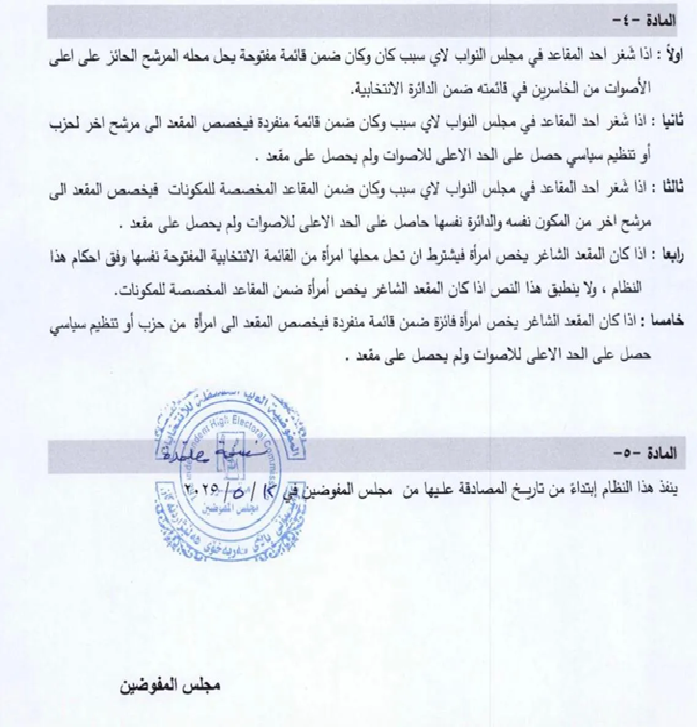 بغداد/ شبكة أخبار العراق- ذكرت مفوضية الانتخابات في وثيقة لها ،اليوم، “إذا شغر أحد المقاعد في مجلس النواب لأي سبب وكان ضمن قائمة مفتوحة يحل محله المرشح الحائز على أعلى الأصوات من الخاسرين في قائمته ضمن الدائرة الانتخابية”.وأضافت: “إذا شغر أحد المقاعد في مجلس النواب لأي سبب وكان ضمن قائمة منفردة فيخصص المقعد الى مرشح آخر من حزب أو تنظيم سياسي حصل على الحد الأعلى للأصوات ولم يحصل على مقعد”.ووفقاً للوثيقة، فإنه اذا شغر أحد المقاعد في مجلس النواب لأي سبب وكان ضمن المقاعد المخصصة للمكونات فيخصص المقعد الى مرشح آخر من المكون نفسه والدائرة نفسها حاصل على الحد الاعلى للأصوات ولم يحصل على مقعد، بينما اذا كان المقعد الشاغر يخص امرأة فيشترط ان تحل محلها امرأة من القائمة الانتخابية المفتوحة نفسها وفق احكام هذا النظام، ولا ينطبق هذا النص اذا كان المقعد الشاغر يخص امرأة ضمن المقاعد المخصصة للمكونات.وتابعت المفوضية: “اذا كان المقعد الشاغر يخص امرأة فائزة ضمن قائمة منفردة فيخصص المقعد الى امرأة من حزب أو تنظيم سياسي حصل على الحد الاعلى للأصوات ولم يحصل على مقعد”.وصادقت المحكمة الاتحادية العليا ، أمس الأحد 14 كانون الأول 2025، على النتائج النهائية للانتخابات العامة لعضوية مجلس النواب.