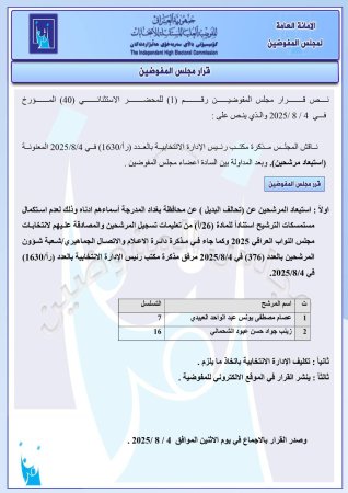 أولاً : استبعاد المرشحين عن (تحالف البديل) عن محافظة بغداد المدرجة أسماؤهم أدناه؛ وذلك لعدم استكمال مستمسكات الترشيح استناداً للمادة (26/أ) من تعليمات تسجيل المرشحين والمصادقة عليهم لانتخابات مجلس النواب العراقي 2025، وكما جاء في مذكرة دائرة الإعلام والاتصال الجماهيري / شعبة شؤون المرشحين بالعدد (376) في 2025/8/4 مرفق مذكرة مكتب رئيس الإدارة الانتخابية بالعدد (رأ/1630) 2025/8/4 ،وأضافت الوثيقة، أن “المرشحين المستبعدين كل من عصام مصطفى يونس عبد الواحد العبيدي، وزينب جواد حسن عبود الشحماني“.