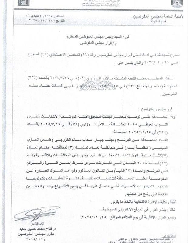 بغداد/ شبكة أخبار العراق- أظهرت وثيقة صادرة عن المفوضية العليا المستقلة للانتخابات بتاريخ، اليوم الثلاثاء (25 تشرين الثاني 2025)، قرارا يقضي باستبعاد المرشح الفائز النصاب من منظمة بدر “مهند الخزرجي” بانتخابات تشرين 2025 لعدم توفر شرط “حسن السيرة والسلوك”.أدناه نص الوثيقة كما وردت لـ”بغداد اليوم”: