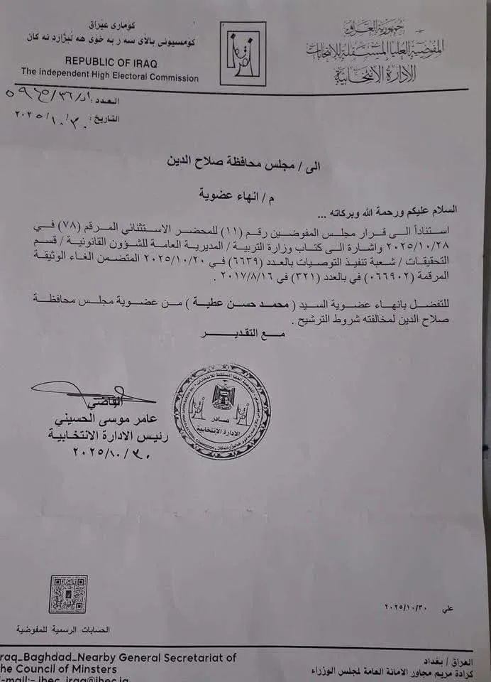 بغداد/ شبكة أخبار العراق- أعلنت المفوضية العليا المستقلة للانتخابات إنهاء عضوية محمد حسن عطية من مجلس محافظة صلاح الدين، موضحة أن القرار صدر لعدم التزامه بشروط الترشيح.ووفقاً لوثيقة صادرة عن الإدارة الانتخابية في المفوضية، جاء القرار استناداً إلى قرار مجلس المفوضين رقم (11) للمحضر الاستثنائي المرقم (78) بتاريخ 28 أكتوبر 2025، وبإشارة إلى كتاب وزارة التربية / المديرية العامة للشؤون القانونية / قسم التحقيقات الإدارية، المتضمن التوصيات اللازمة لإنهاء العضوية المرقمة (3069) في العدد (322) بتاريخ 6 نوفمبر 2017.وفي السياق ذاته، وجهت المفوضية كتاباً رسمياً إلى مجلس محافظة صلاح الدين للتنفيذ الفوري للقرار وإنهاء عضوية عطية، مؤكدة أن هذا الإجراء يأتي ضمن إطار الرقابة على التزام أعضاء المجالس المحلية بشروط الترشح والقوانين النافذة.وأكد رئيس الإدارة الانتخابية، عامر موسى الحسيني، في توقيعه على الكتاب الرسمي، حرص المفوضية على ضمان نزاهة العملية الانتخابية وشفافية عمل المجالس المحلية، مشدداً على ضرورة اتخاذ الإجراءات اللازمة لتطبيق القرار وفق القانون.