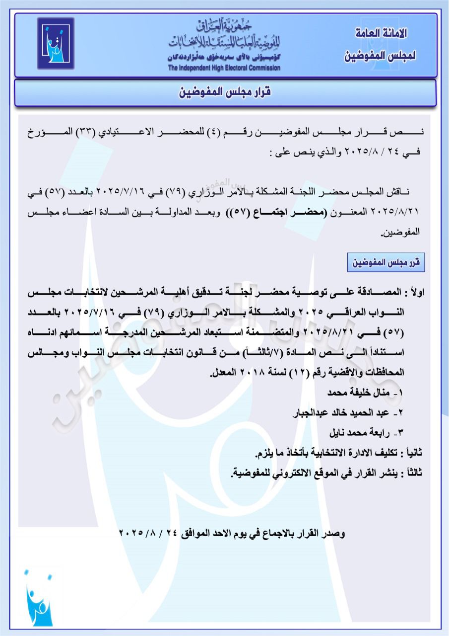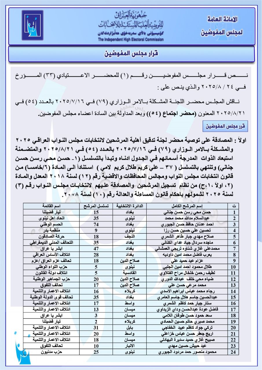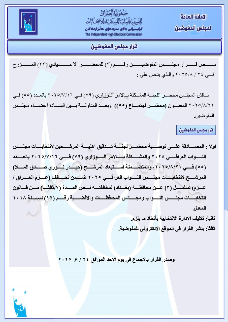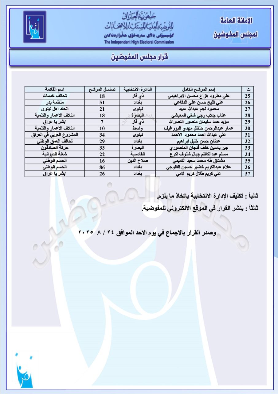 الرئيسيةسياسية مفوضية الانتخابات تستبعد مجموعة جديدة من المرشحين للانتخابات آخر تحديث: 24 غشت 2025 - 3:09 مبغداد/ شبكة أخبار العراق- استبعدت مفوضية الانتخابات مجموعة جديدة من المرشحين للانتخابات كما مبين أدناه…