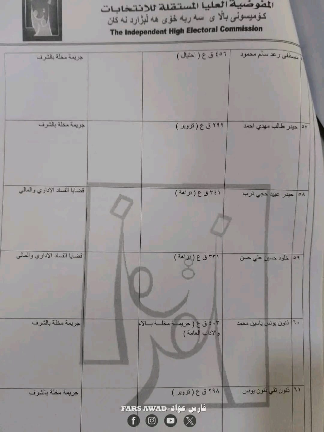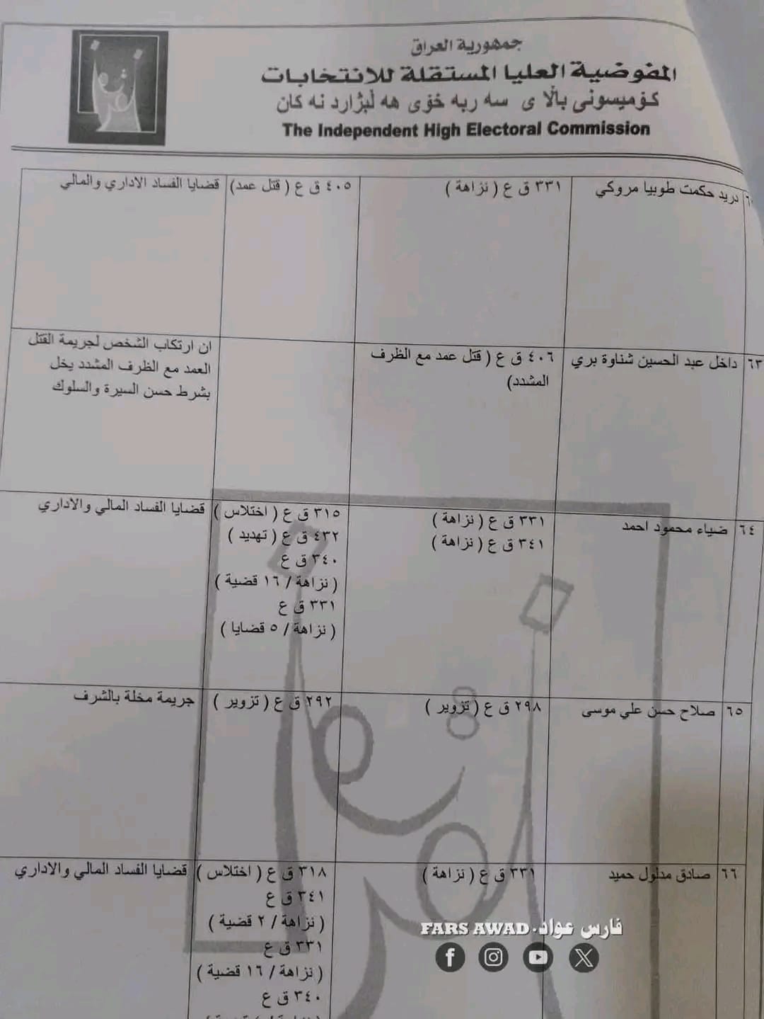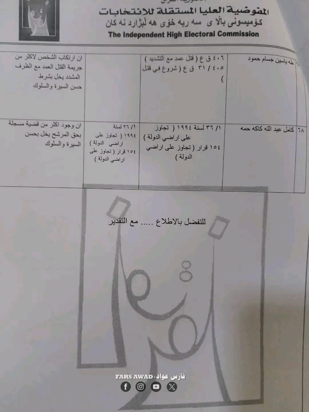 مفوضية الانتخابات تستبعد (68) مرشحاً من الانتخابات لقيودهم الجنائية