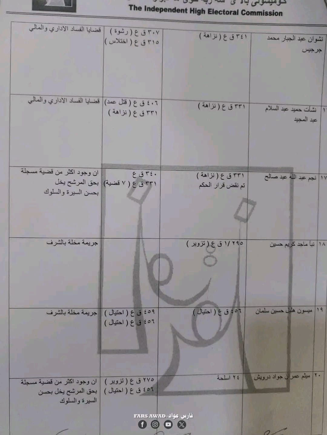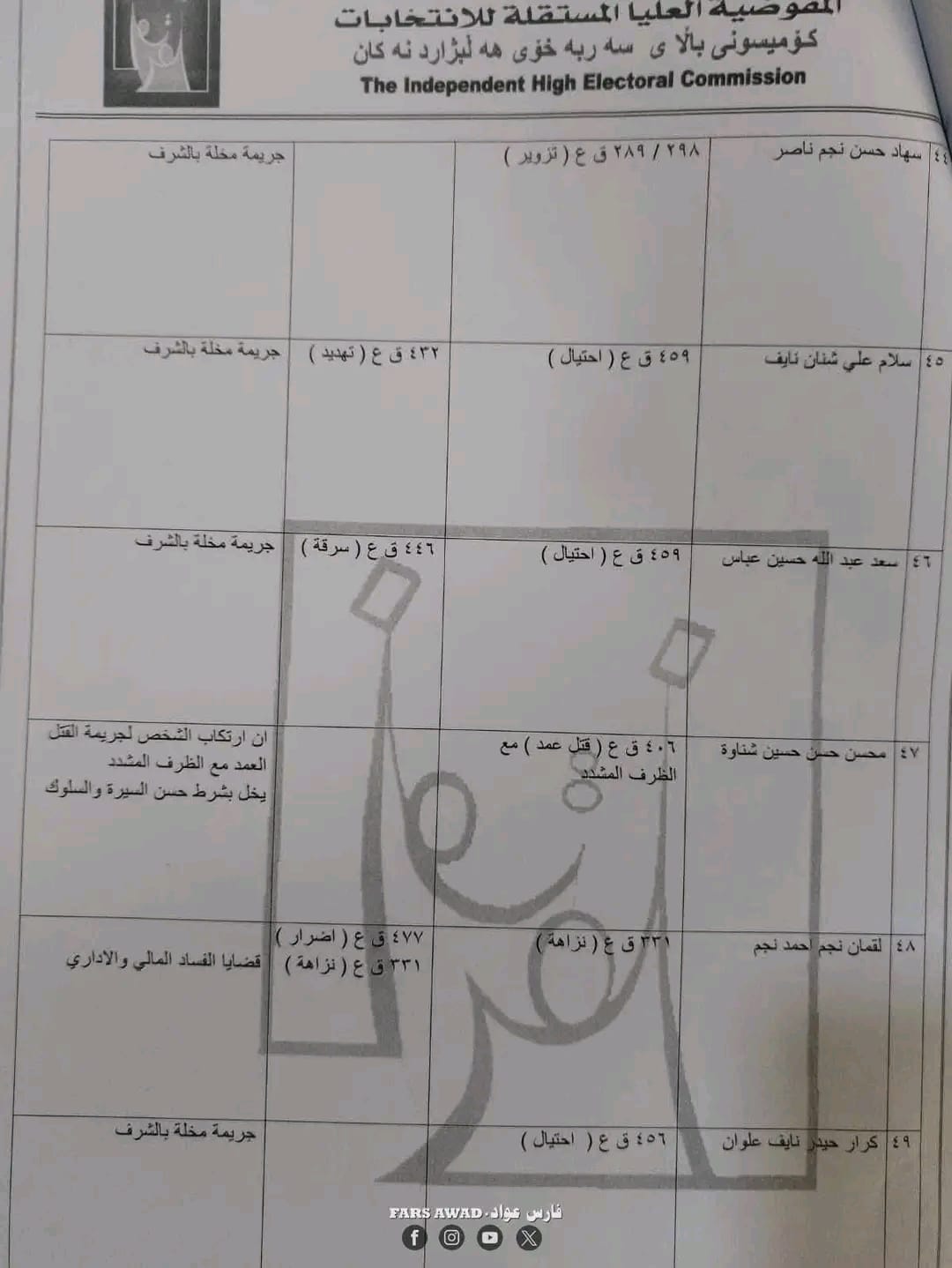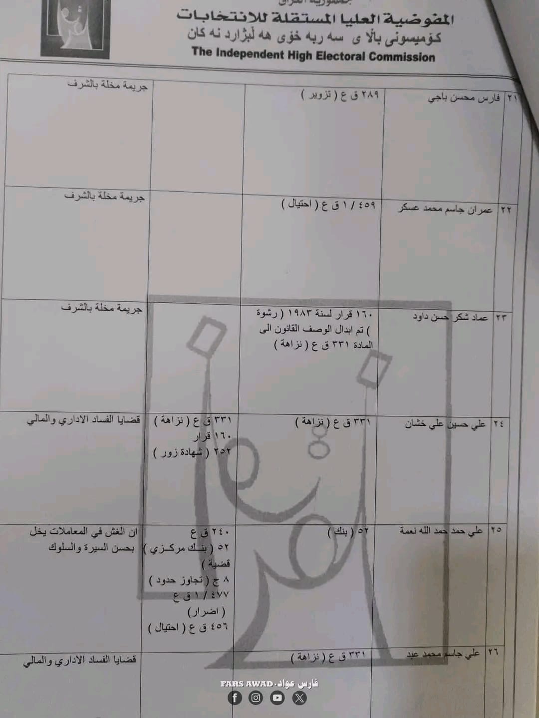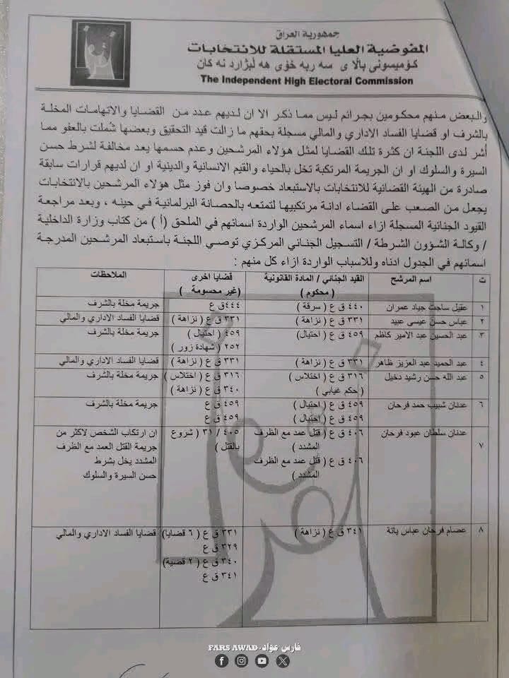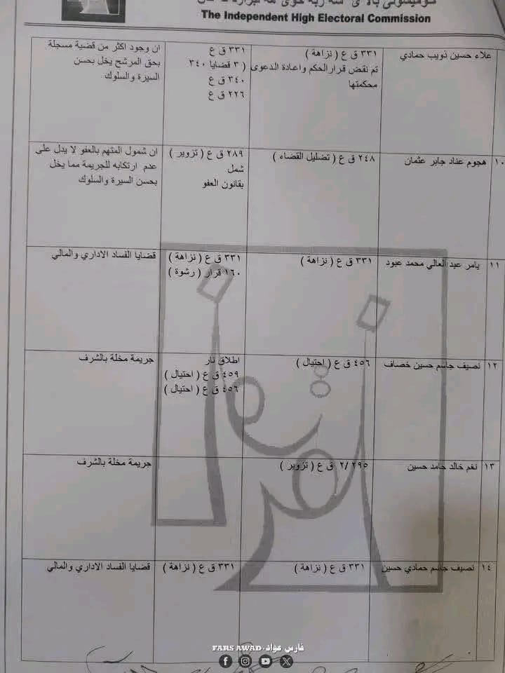 بغداد/ شبكة أخبار العراق- قررت المفوضية العليا المستقلة للانتخابات، امس الأحد، استبعاد عدد من المرشحين لانتخابات مجلس النواب العراقي في تشرين الثاني/ نوفمبر 2025.وأظهرت الوثائق الرسمية الخاصة بالاستبعاد – أن القرار جاء بعد التحقق من “وجود قيود جنائية بحقهم تتعلق بجرائم القتل، الرشوة، التزوير، الاحتيال، إضافة إلى قضايا الفساد المالي والإداري”.