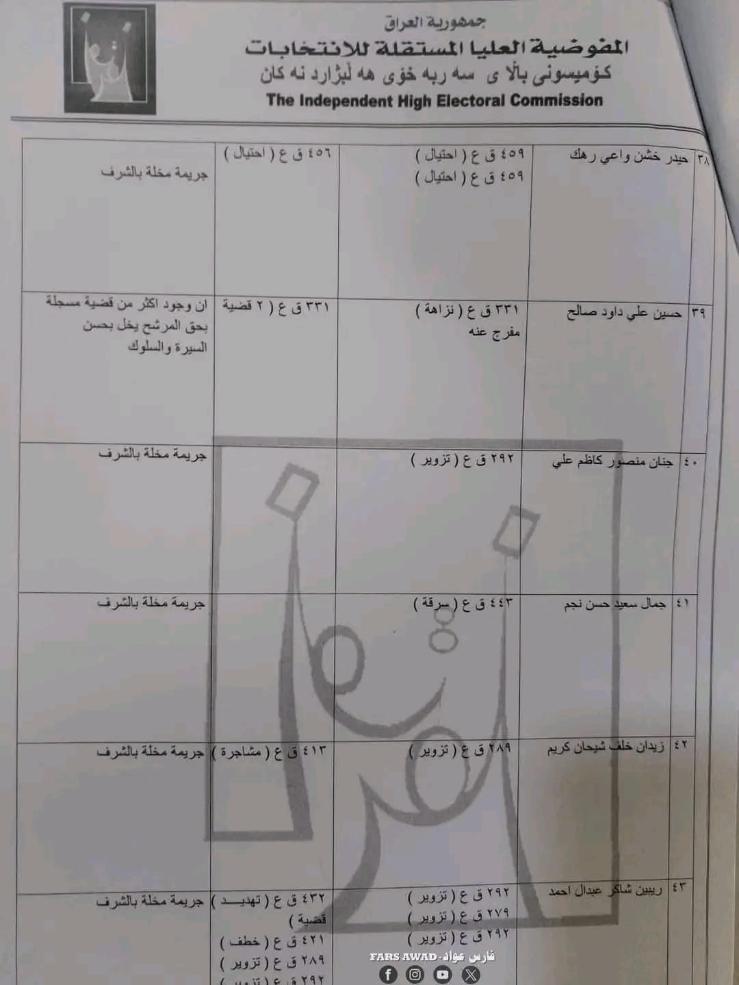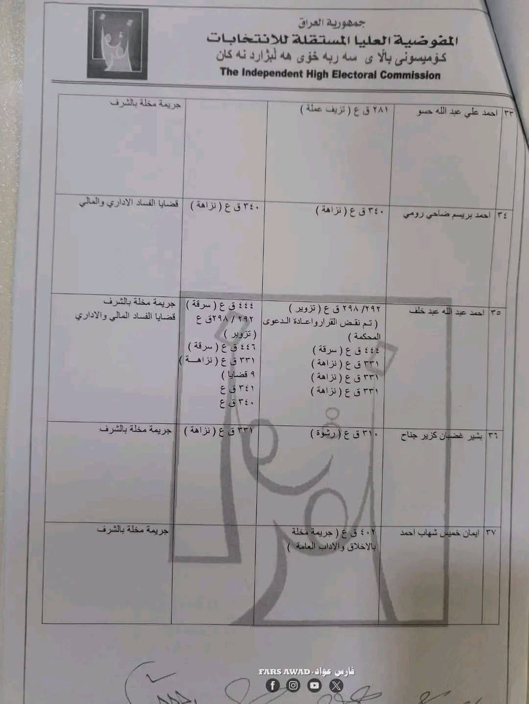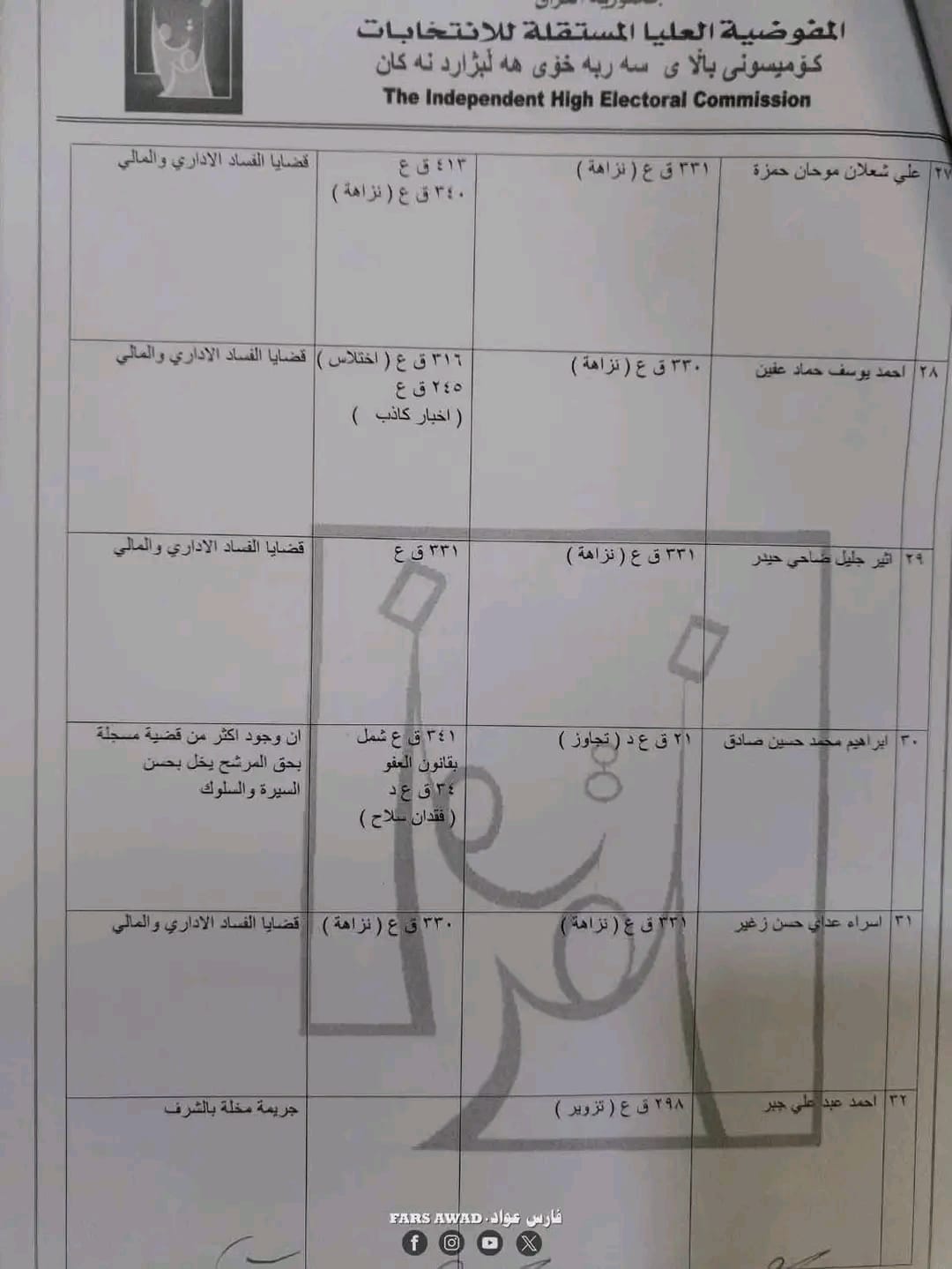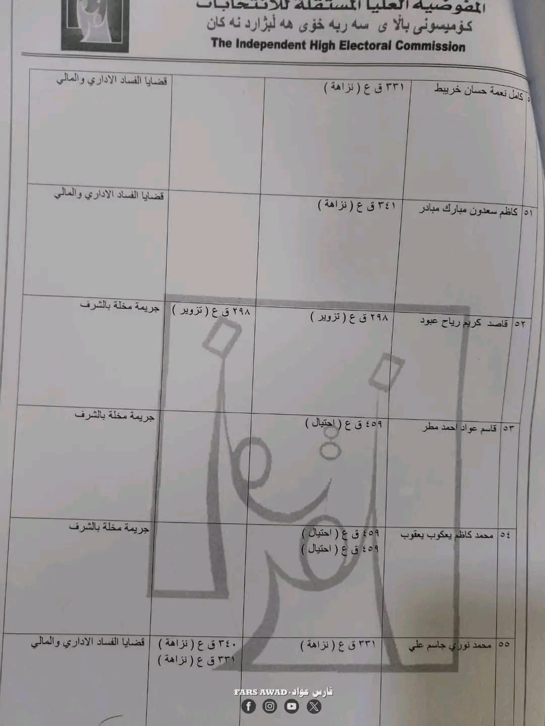 بغداد/ شبكة أخبار العراق- قررت المفوضية العليا المستقلة للانتخابات، امس الأحد، استبعاد عدد من المرشحين لانتخابات مجلس النواب العراقي في تشرين الثاني/ نوفمبر 2025.وأظهرت الوثائق الرسمية الخاصة بالاستبعاد – أن القرار جاء بعد التحقق من “وجود قيود جنائية بحقهم تتعلق بجرائم القتل، الرشوة، التزوير، الاحتيال، إضافة إلى قضايا الفساد المالي والإداري”.