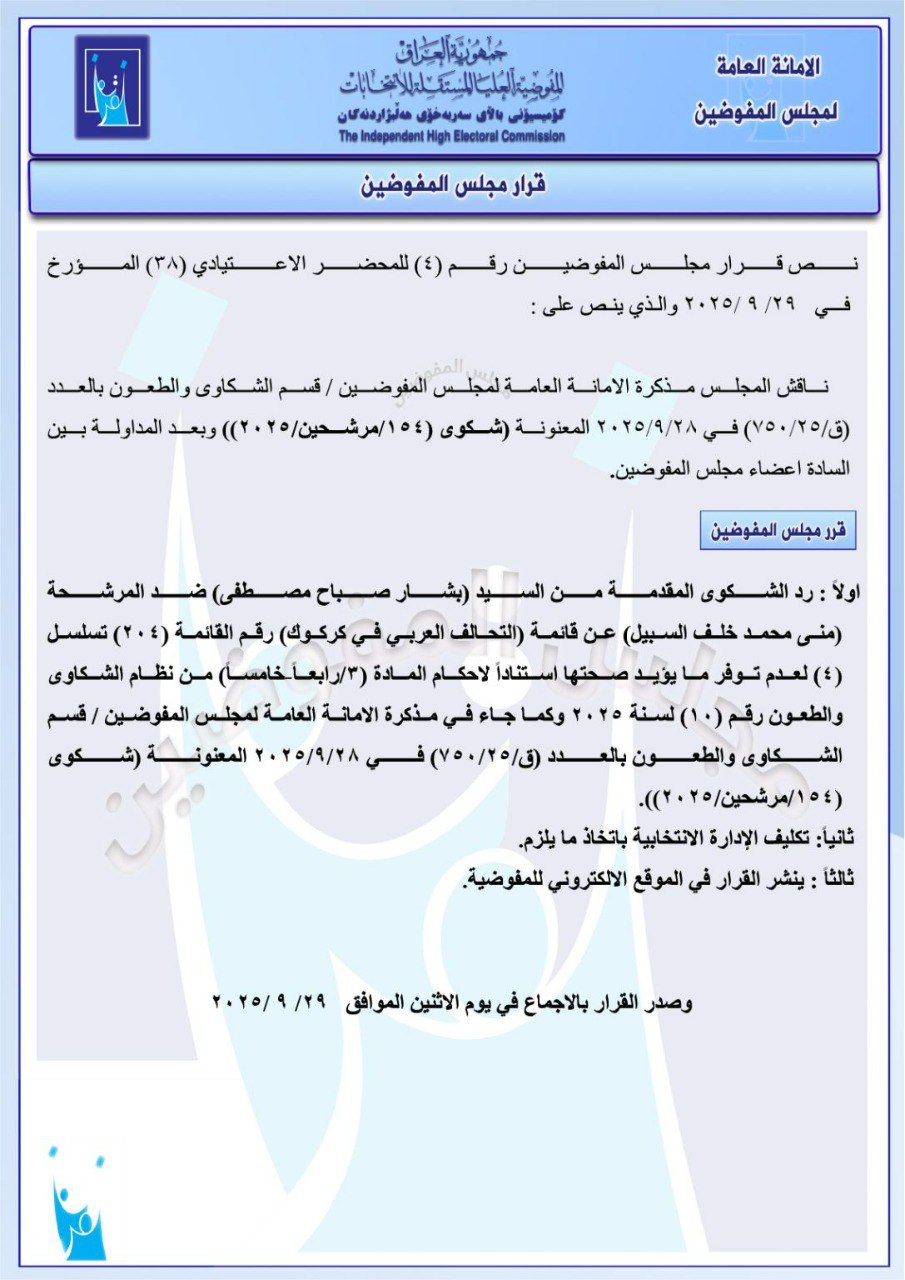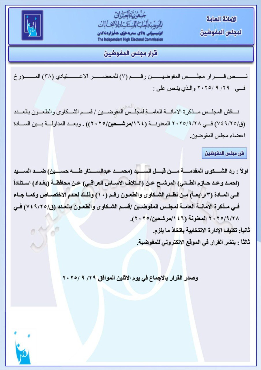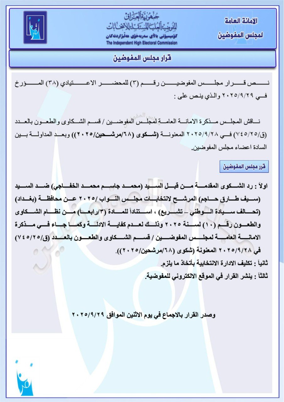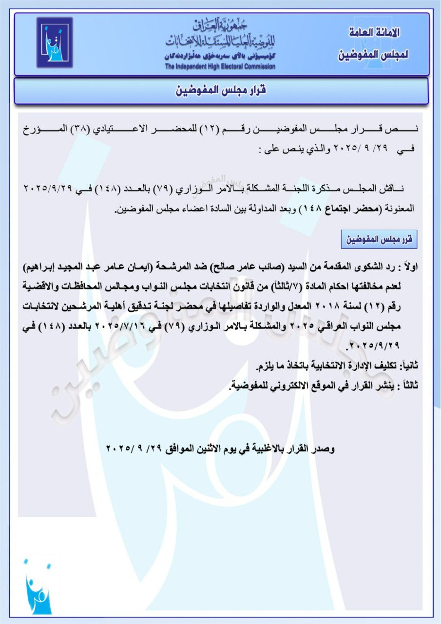 بغداد/ شبكة أخبار العراق- أصدر مجلس المفوضين في المفوضية العليا المستقلة للانتخابات العراقية، يوم امس الاثنين، 13 قراراً جديداً تتضمن الإبقاء على استبعاد بعض المرشحين، وفرض غرامات ورد شكاوى تتعلق بمرشحين آخرين. وجاء في وثائق للمجلس، إن قرار مجلس المفوضين رقم (1) للمحضر الاعتيادي (38) المؤرخ بتاريخ اليوم فرض غرامة مالية قدرها خمسة ملايين دينار على المرشح علي مزهر عيدان عن ائتلاف دولة القانون عن محافظة بغداد. ونصت كذلك على فرض غرامة مالية قدرها خمسة ملايين دينار على المرشحة شذى ياسين عبد الكريم، عن تحالف عزم العراق (عزم محافظة بغداد).وجاء في قرار المجلس، رد شكوى مقدمة بحق عدد من المرشحين للانتخابات المقبلة في بغداد وعدد من المحافظات، وكذلك قرار عدم استبدال عدد من المرشحين في بغداد والنجف وصلاح الدين ونينوى.