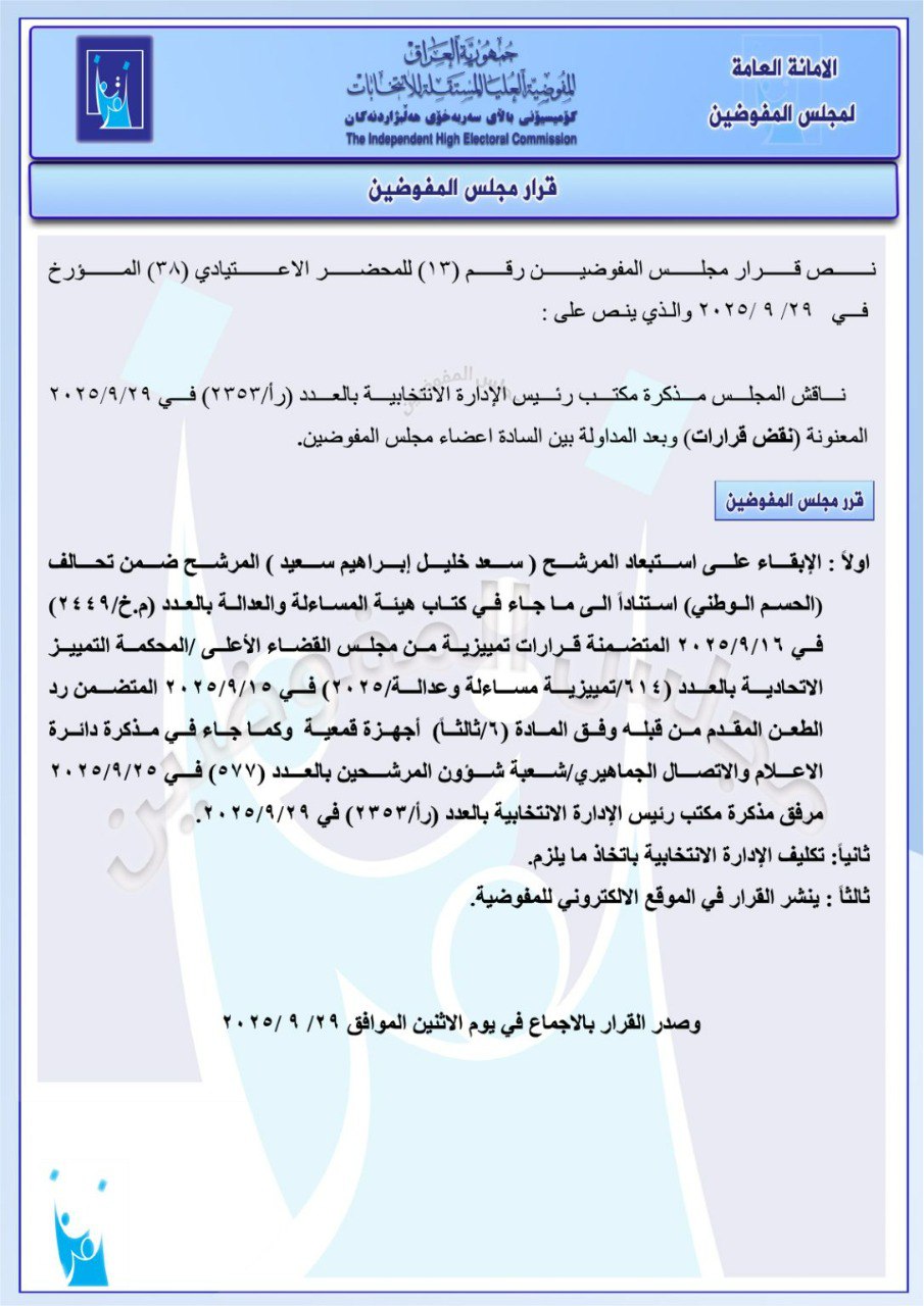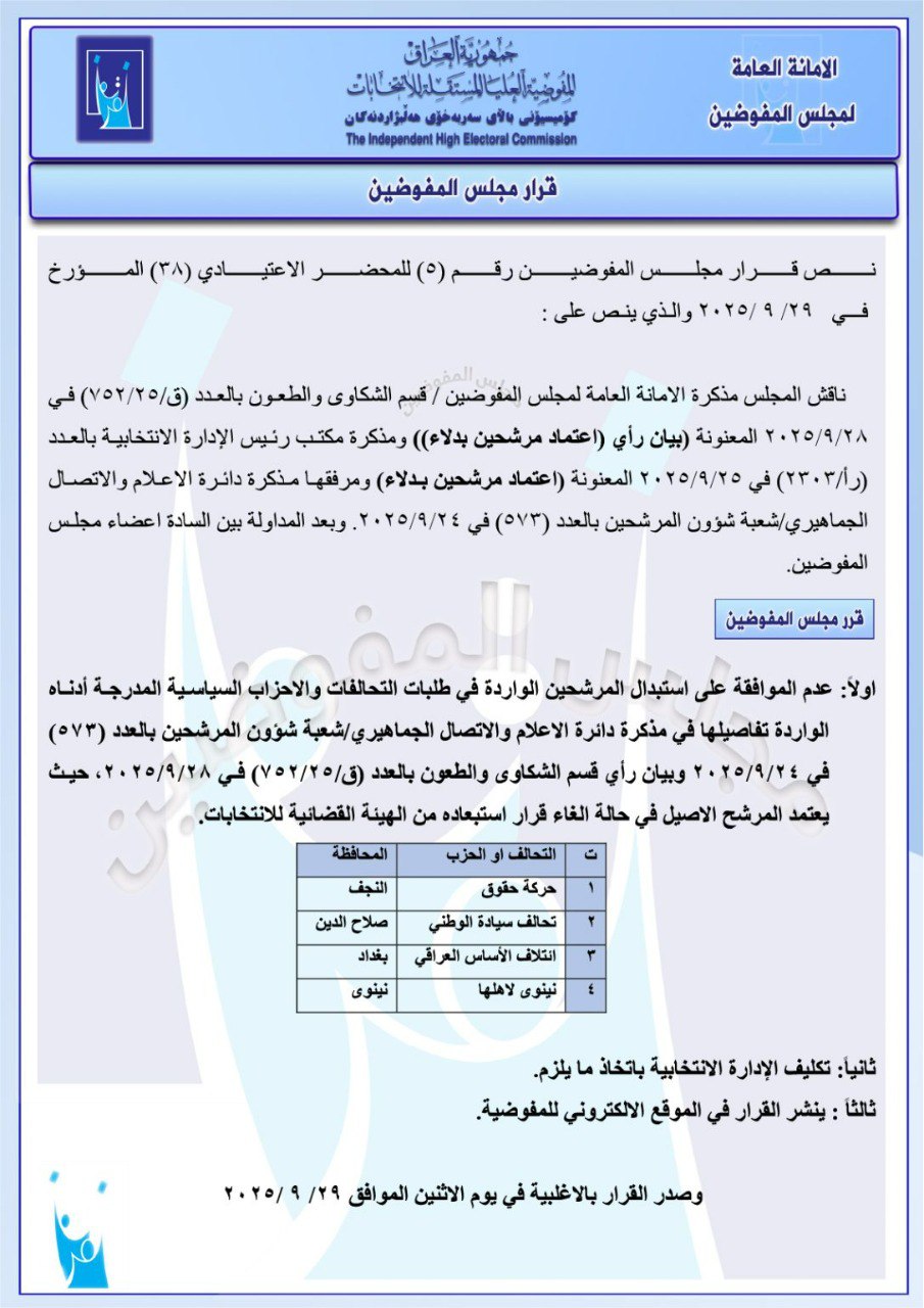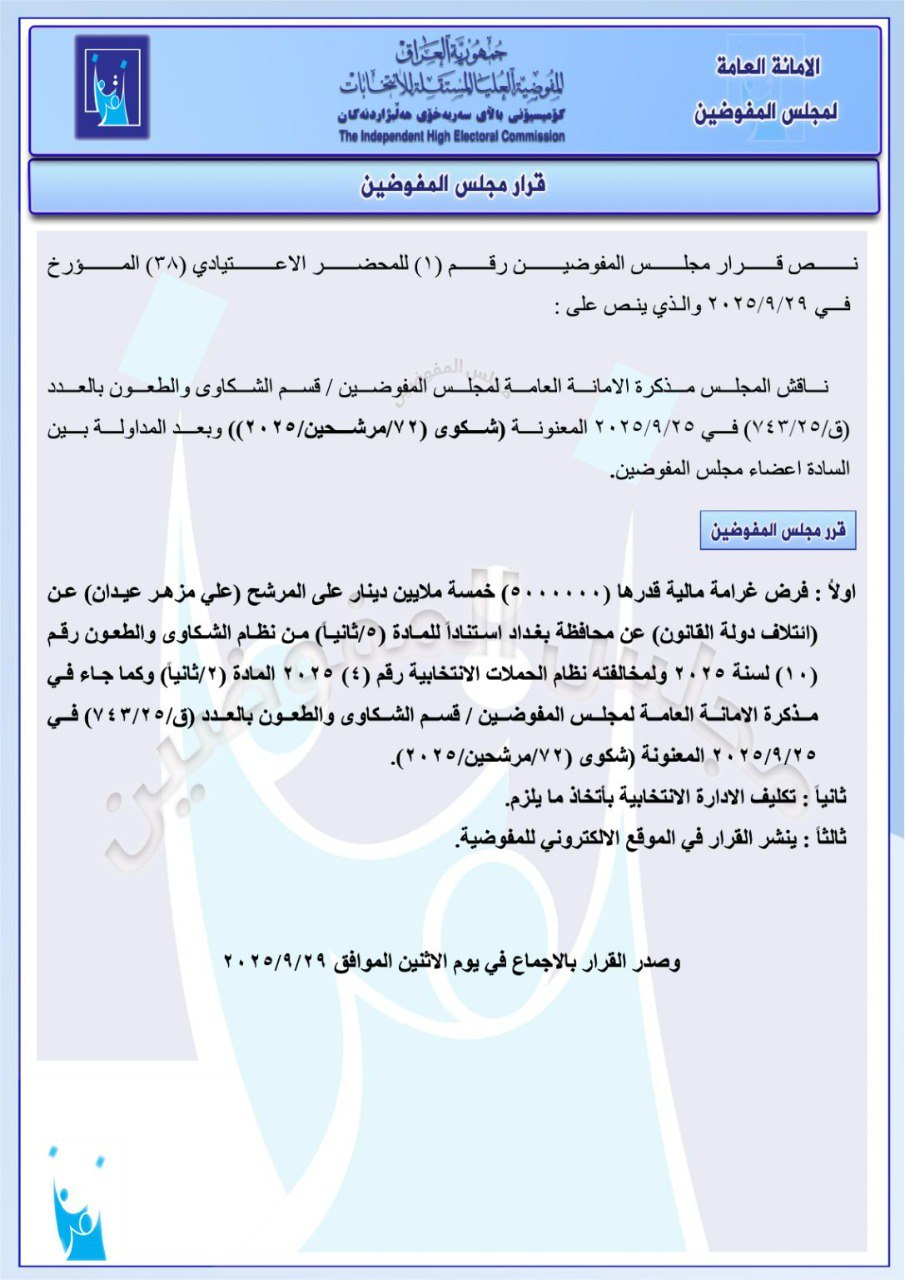 مفوضية الانتخابات تصدر عدة قرارات بشأن الاستبعاد وفرض الغرامات
