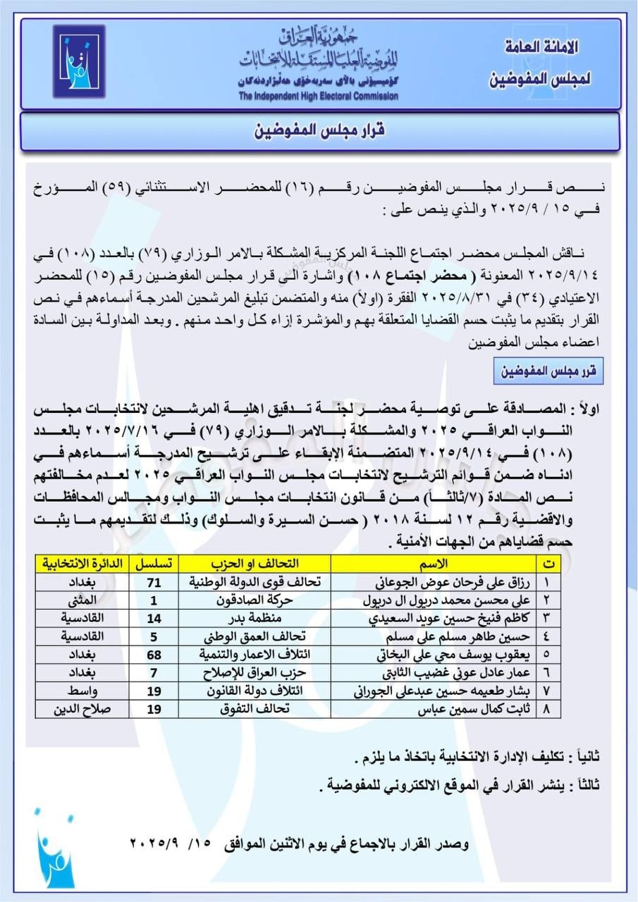 بغداد/ شبكة أخبار العراق- أقر مجلس المفوضين في المفوضية العليا المستقلة للانتخابات بحسب وثيقة، مؤرخة الاثنين (15 أيلول 2025)، توصية اللجنة المركزية المشكلة بالأمر الوزاري، بشأن المصادقة على أهلية ثمانية مرشحين لانتخابات مجلس النواب المقبلة، بعد استكمال التدقيق الأمني والإداري الخاص بسيرهم وملفاتهم.