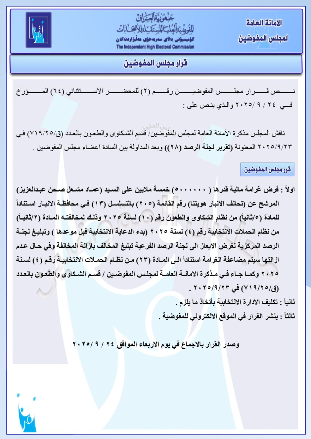 بغداد/ شبكة أخبار العراق- أعلنت مفوضية الانتخابات العراقية، اليوم الخميس، فرض غرامات على 24 مرشحاً و6 تحالفات سياسية على خلفية مخالفات لنظام الحملات الانتخابية.وأظهرت وثائق للمفوضية، أن مجلس المفوضين قرر فرض غرامات مالية قدرها 2 مليون دينار بحق 23 مرشحاً للانتخابات، و6 أحزاب وتحالفات سياسية، لمخالفة نظام الحملات الانتخابية.كما أظهرت وثيقة أخرى أن المجلس فرض غرامة مالية قدرها 5 ملايين دينار على مرشح آخر لبدء الحملة الانتخابية قبل موعدها، وفقاً لما جاء في الوثيقة.وشملت الغرامات ائتلاف الإعمار والتنمية الذي يتزعمه رئيس الوزراء محمد شياع السوداني، وائتلاف دولة القانون الذي يتزعمه نوري المالكي، فضلاً عن تحالف الأساس برئاسة محسن المندلاوي، ومرشحين آخرين.