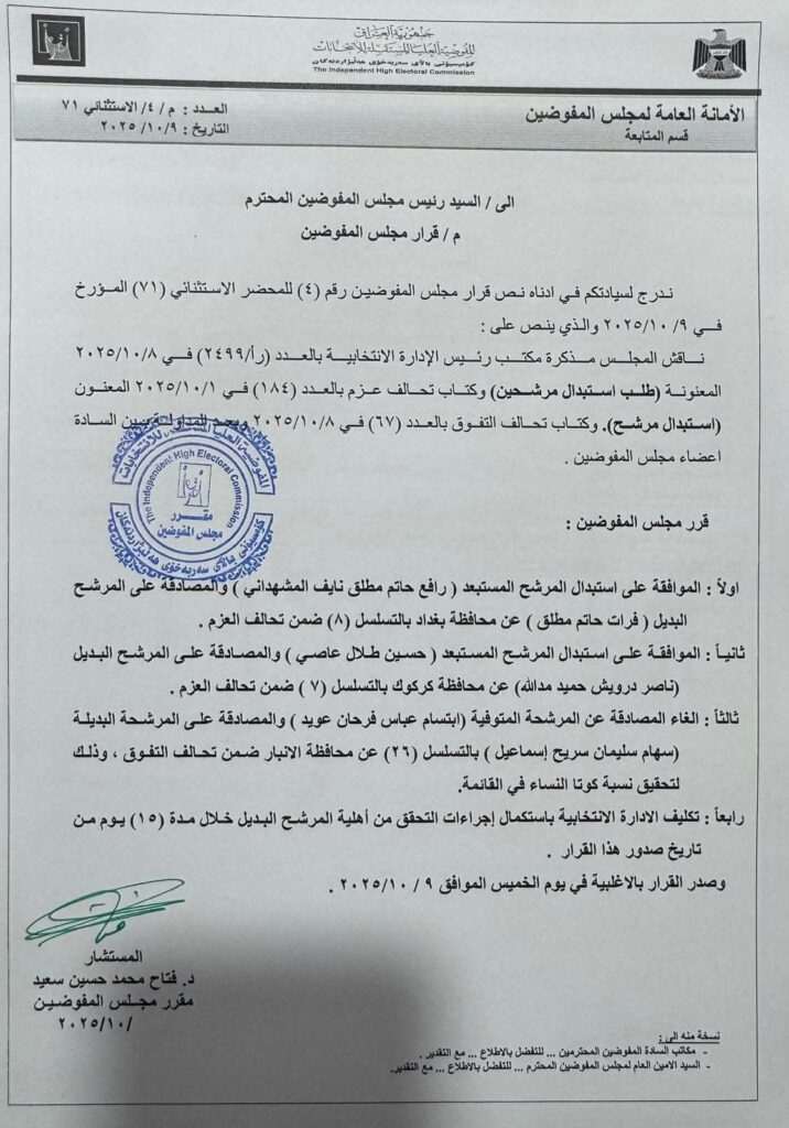 بغداد/ شبكة أخبار العراق- أعلنت المفوضية العليا المستقلة للانتخابات، الخميس الماضي، عن موافقتها الرسمية على استبدال المرشحين الذين تم استبعادهم بعد تاريخ 4 أيلول 2025، مشيرة إلى أن الإجراءات تمت وفقًا للسياقات القانونية المعتمدة لضمان نزاهة العملية الانتخابية.وأكدت المفوضية في بيان، أن هذه الخطوة تأتي في إطار حرصها على شفافية وانتظام الانتخابات، وتمت بعد دراسة الطلبات المقدمة من الكيانات السياسية والأفراد المشمولين بالاستبعاد.وشملت قائمة المستبدلين عدداً من الأسماء، من بينهم المرشح حميد الهايس، الذي كان قد أثار جدلاً واسعاً بعد استبعاده في وقت سابق.وشددت المفوضية على أن جميع قراراتها تُتخذ بناءً على الأسس القانونية ووفقاً لما نصّ عليه قانون الانتخابات، داعيةً جميع الأطراف السياسية إلى احترام الإجراءات القانونية والسياقات المعتمدة.