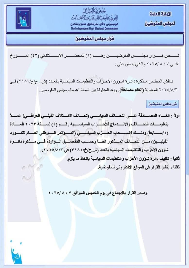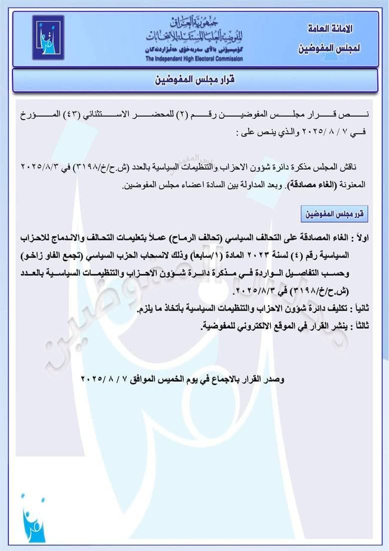 بغداد/ شبكة أخبار العراق-قرر مجلس المفوضين في المفوضية العليا المستقلة للانتخابات العراقية، يوم الخميس، إلغاء المصادقة على ستة تحالفات سياسية (الرماح، الضمير العراقي، ائتلاف شموخ البصرة، استحقاق ديالى، مدينتي، والائتلاف الفيلي العراقي).كما صادق مجلس المفوضين في مجموعة قرارات أصدرتها المفوضية وتنشرها وكالة شفق نيوز أدناه، على توصية لجنة تدقيق أهلية المرشحين للانتخابات المتضمنة استبعاد (قاسم القطبي) مرشح فرد عن المقعد الفيلي في محافظة واسط لمخالفته نص المادة (7/ ثالثاً) من قانون الانتخابات.