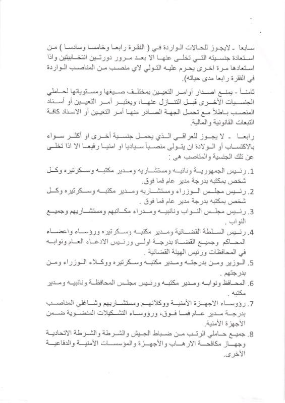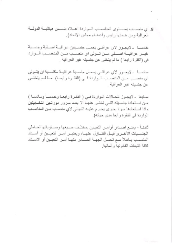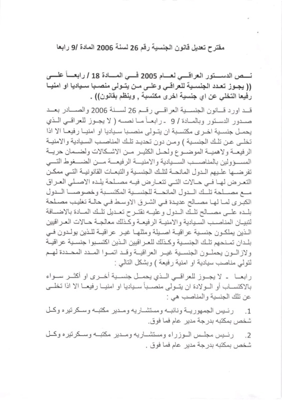 كما يؤكد المقترح أن استعادة الجنسية العراقية بعد التنازل عنها لأغراض التعيين، لا تمنح الحق بالعودة إلى المنصب مجددًا.”