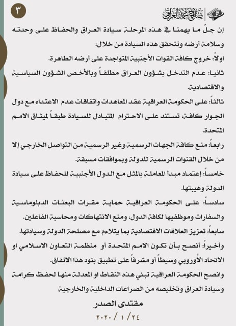 بغداد/شبكة أخبار العراق- قدم زعيم التيار الصدري، مقتدى الصدر، امس الجمعة، مبادرة، تهدف الى خروج القوات الأميركية وفق آلية محددة، فيما دعا الحكومة العراقية الى تبنيها، أو تعديلها ومن ثم تبنيها.وتضمنت المبادرة التي اطلقها الصدر، يوم أمس (24 كانون الثاني 2020)، حزمة من النقاط، بينها “تأجيل العمل بالخيار العسكري في مسألة الوجود الأمريكي وفسح المجال للخيار السياسي، وغلق فوري للقواعد العسكرية وغلق الأجواء العراقية أمام الطائرات العسكرية الأمريكية”.وأدناه نص المبادرة…