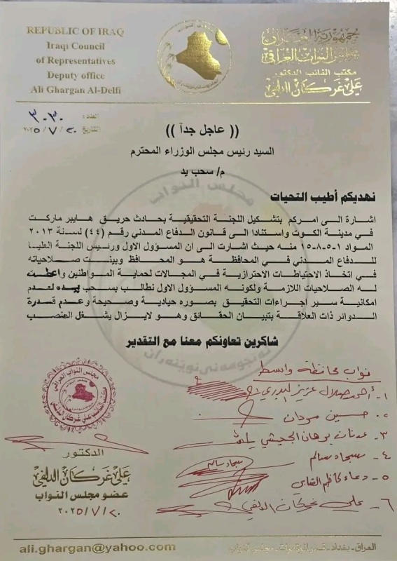 بغداد/ شبكة أخبار العراق- طالب 6 نواب، اليوم الاحد (20 تموز 2025)، رئيس مجلس الوزراء محمد شياع السوداني سحب يد محافظ واسط محمد جميل المياحي نتيجة حادث حريق “هايبر ماركت” الكوت.وبحسب الوثيقة ادناه  فان النواب هم كل من (احمد صلال عزيز البدري وحسين مردان وعدنان برهان الجحيشي، اضافة الى سجاد سالم ودعاء كاظم العقابي وعلي غركان الدلفي):