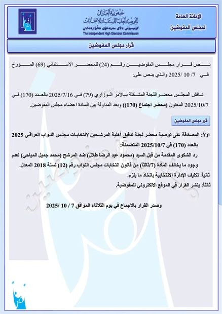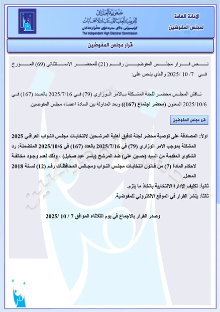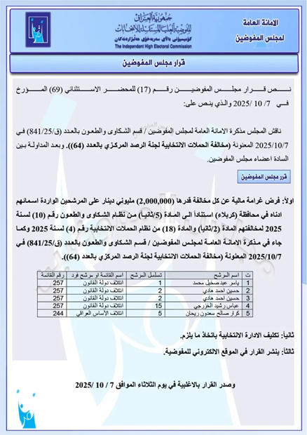 بغداد/ شبكة أخبار العراق- قررت مفوضية الانتخابات ،الاربعاء، أبقاء صهري المالكي في السباق الانتخابي وفرض غرامات مالية عليهما  وكذلك ابقاء المتهم بحريق مول الكوت والمحال للقضاء المحافظ السابق محمد المياحي وفق كتبها أدناه …