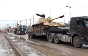 Kurdish Peshmerga armoured vehicles are transported on trucks on the outskirts of Kirkuk, some 250km (155 miles) north of Baghdad, November 24, 2012. Iraq’s Kurdish region has sent reinforcements to a disputed area where its troops are involved in a standoff with the Iraqi army, a senior Kurdish military official said, despite calls on both sides for dialogue to calm the situation. Picture taken November 24, 2012. REUTERS/Azad Lashkari (IRAQ – Tags: CONFLICT POLITICS MILITARY)