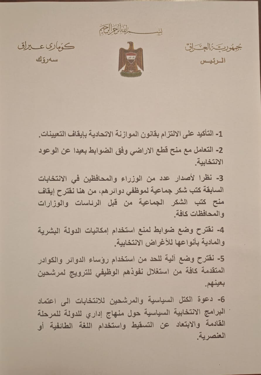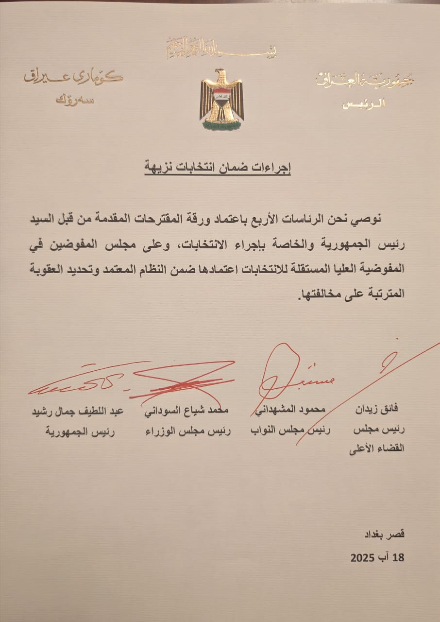 بغداد/ شبكة أخبار العراق- اتفقت الرئاسات العراقية الأربع على شروط “صارمة” تُلزم الوزراء والمسؤولين الحكوميين والأحزاب والمرشحين للانتخابات التشريعية المقبلة بعدة ضوابط لضمان نزاهة الانتخابات.وفق وثيقة موقعة من قبل رئيس الجمهورية عبد اللطيف جمال رشيد، ورئيس مجلس الوزراء محمد شياع السوداني، ورئيس مجلس النواب محمود المشهداني، ورئيس مجلس القضاء الأعلى فائق زيدان، بتاريخ يوم أمس، تتضمن ست نقاط.الوثيقة وما تضمنته من إلزامات موجهة إلى المفوضية العليا المستقلة للانتخابات بغية تبنيها لهذه التوصيات والعمل بها.