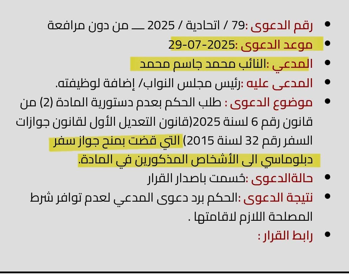 بغداد/ شبكة أخبار العراق- ردت المحكمة الاتحادية، اليوم الخميس، دعوى طالبت بإلغاء منح الجواز الدبلوماسي مدى الحياة لعضو مجلس النواب وأسرته.وكان عضو مجلس النواب محمد جاسم محمد قد رفع دعوى الى المحكمة طالب فيها بالحكم بعدم دستورية المادة 2 من قانون رقم 6 لسنة 2025 (قانون التعديل الأول لقانون جوازات السفر رقم 32 لسنة 2015) التي قضت بمنح جواز سفر دبلوماسي إلى الأشخاص المذكورين في المادة.وقررت المحكمة الحكم برد دعوى المدعي لعدم توافر شرط المصلحة اللازمة لإقامتها.وهذه ليست المرة الاولى التي ترد فيها المحكمة الاتحادية الطعن في قانون الجوازات إذ صرح ،النائب المستقل أمير المعموري، في مطلع آذار/مارس الماضي رد دعوى أقامها ضد رئيس مجلس النواب العراقي محمود المشهداني، بشأن تعديل قانون الجوازات.وصوت مجلس النواب خلال جلسته الاعتيادية، (13 كانون الثاني 2025)، على مقترح قانون التعديل الاول لقانون جوازات السفر رقم 32 لسنة 2015.يذكر أن لجنة النزاهة النيابية قد كشفت، في العام 2023، عن إصدار 32 ألف جواز دبلوماسي بينها 10 الاف جواز لأشخاص ليسوا من السلك الدبلوماسي ولا موظفين بوزارة الخارجية.