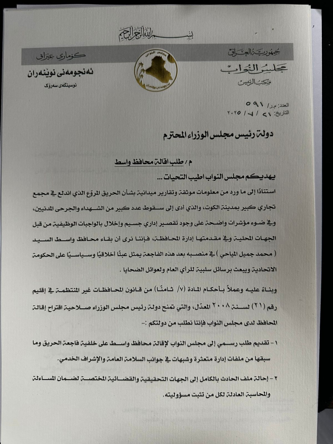 بغداد/ شبكة أخبار العراق- طالبت رئاسة مجلس النواب العراقي، يوم الاثنين، رئيس مجلس الوزراء محمد شياع السوداني بإقالة محافظ واسط على خلفية “فاجعة الكوت” والتي راح ضحيتها العشرات من المواطنين.وجاء في طلب رسمي بتاريخ اليوم موجه من رئيس المجلس محمود المشهداني إلى السوداني، اطلعت عليه وكالة شفق نيوز “استناداً إلى ما ورد من معلومات موثقة وتقارير ميدانية بشأن الحريق المروّع الذي اندلع في مجمع تجاري كبير بمدينة الكوت، وأدى لسقوط عدد كبير من الشهداء والجرحى المدنيين، وفي ضوء مؤشرات واضحة على وجود تقصير إداري جسيم وإخلال بالواجبات الوظيفية من قبل الجهات المحلية وفي مقدمتها إدارة المحافظة، نرى أن بقاء محافظ واسط محمد جميل المياحي في منصبه بعد هذه الفاجعة يمثل عبئاً أخلاقياً وسياسياً على الحكومة الاتحادية ويبعث برسائل سلبية للرأي العام ولعوائل الضحايا”.ودعا المشهداني في طلبه، رئيس الوزراء إلى تقديم طلب رسمي إلى مجلس النواب لإقالة محافظ واسط على خلفية فاجعة الحريق وما سبقها من ملفات إدارة متعثرة وشبهات في جوانب السلامة العامة والإشراف الخدمي.وإحالة ملف الحادث بالكامل إلى الجهات التحقيقية والقضائية المختصة لضمان المساءلة والمحاسبة العادلة لكل من تثبت مسؤوليته.وتضمن الطلب توقيع 54 نائباً يؤيدون إقالة محافظ واسط.وفي ليلة الأربعاء/ الخميس من الأسبوع الماضي، اندلع حريق في مجمع “هايبر ماركت” وسط مدينة الكوت مركز محافظة واسط وأسفر عن مصرع أكثر من 60 مواطناً من رجال ونساء وأطفال ومسنين.
