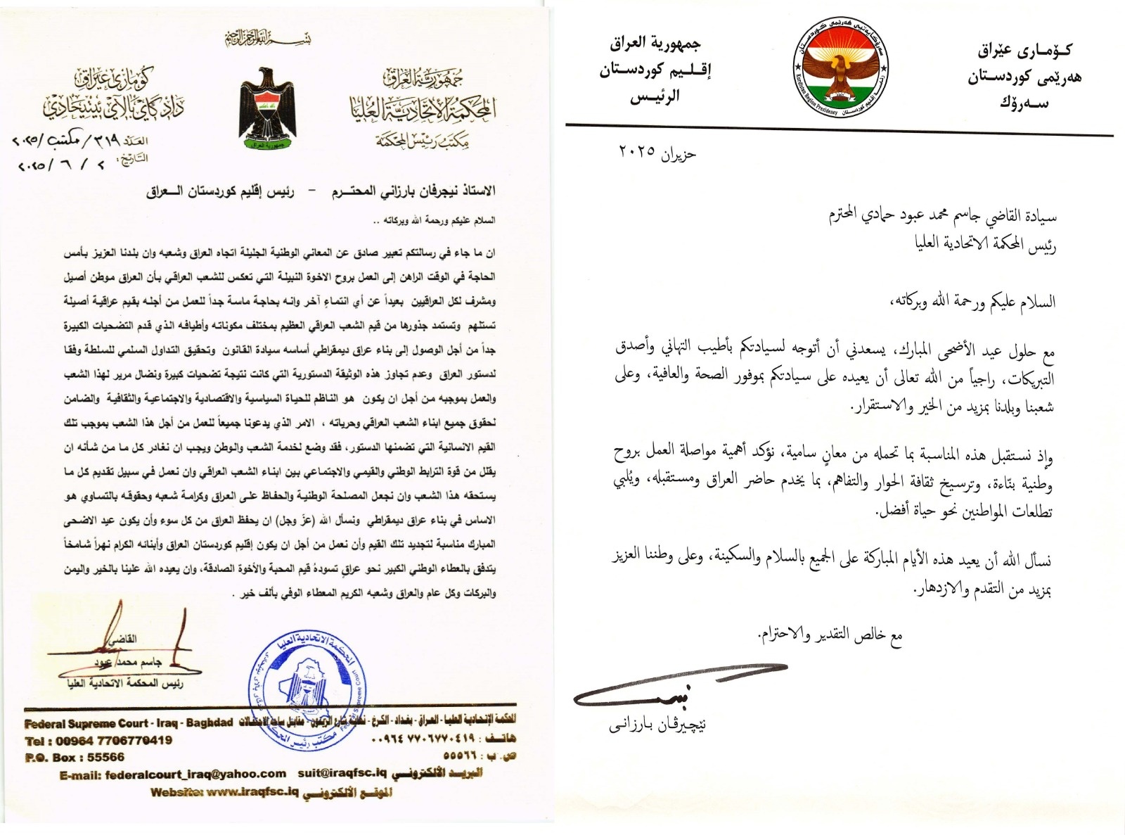 بغداد/ شبكة أخبار العراق- وجه رئيس المحكمة الاتحادية العليا، القاضي جاسم محمد، اليوم الأربعاء (4 حزيران 2025)، رسائل منفردة إلى الرئاسات في بغداد وإقليم كردستان، مؤكدًا على وجوب العمل بموجب الدستور.وتأتي هذه الخطوة من أعلى سلطة قضائية في العراق في سياق التوترات المستمرة بين الحكومة الاتحادية وإقليم كردستان حول قضايا مختلفة، لاسيما ملفات الموازنة والنفط والغاز والمنافذ الحدودية، والتي غالبًا ما تحال إلى المحكمة الاتحادية للبت فيها.وتؤكد رسائل القاضي جاسم محمد على أهمية الالتزام بالإطار الدستوري كمرجعية أساسية لحل الخلافات وضمان سير العمل الحكومي في كل من المركز والإقليم.