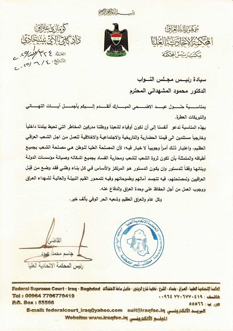 رئيس المحكمة الاتحادية يدعو الحكومة الاتحادية والإقليم ومجلس النواب العمل بالدستور