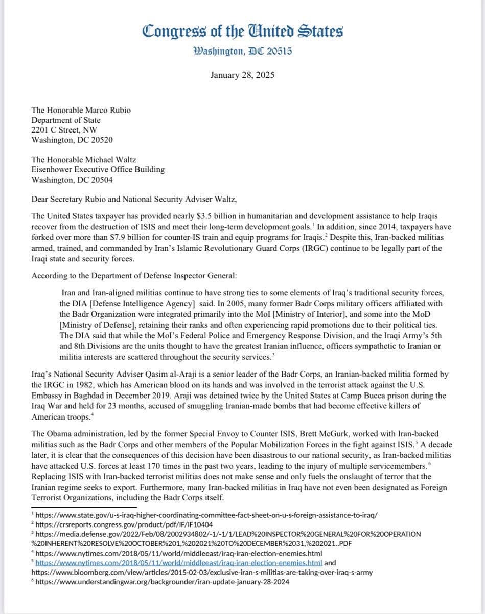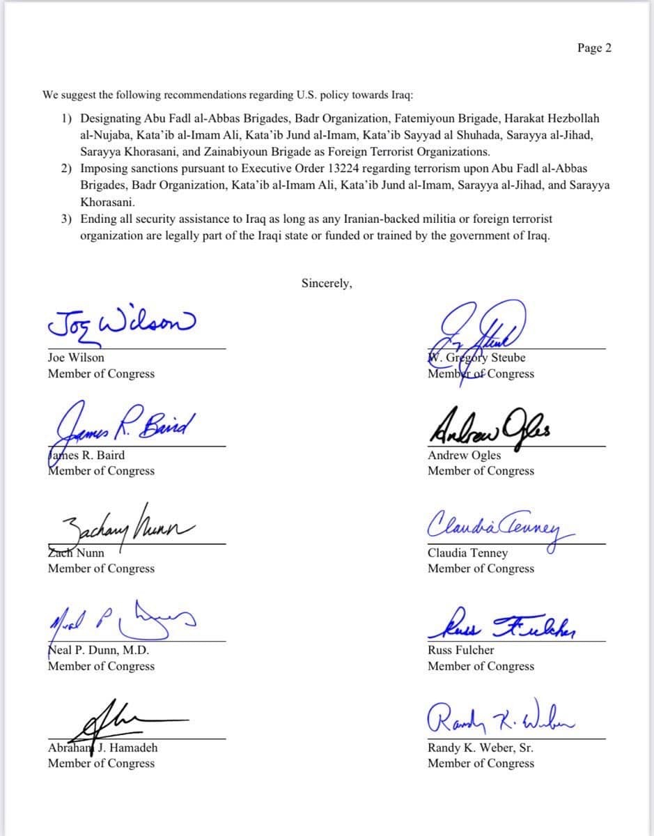 بغداد/شبكة أخبار العراق- تقدم عدد من أعضاء الكونغرس الأمريكي بطلب لوضع فصائل عراقية على لائحة الإرهاب.ونشر النائب الأمريكي جو ويلسون على صفحته في موقع أكس “يشرفني أن أتقدم بهذه الرسالة مع عشرة أعضاء آخرين من الكونجرس إلى وزير الخارجية مطالبين بتصنيف بدر كمنظمة إرهابية إلى جانب جميع الميليشيات الإيرانية الأخرى في العراق.وختم تغريدته بالقول “ترامب سوف يصلح الأمر!”.