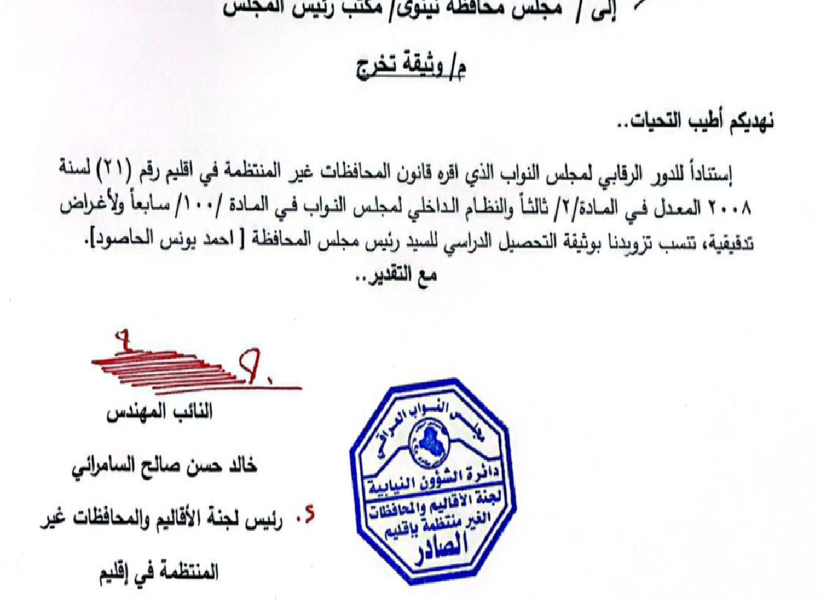 الأقاليم النيابية تطالب بوثيقة تخرج رئيس مجلس محافظة نينوى