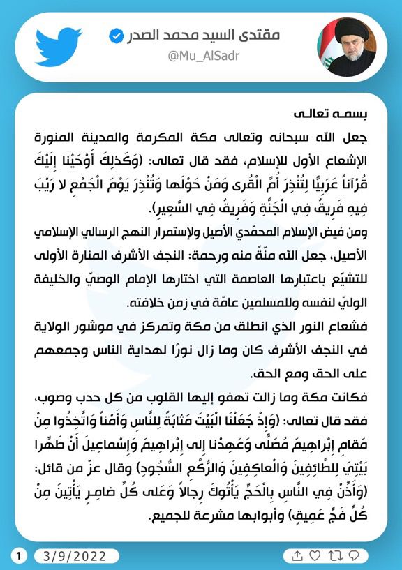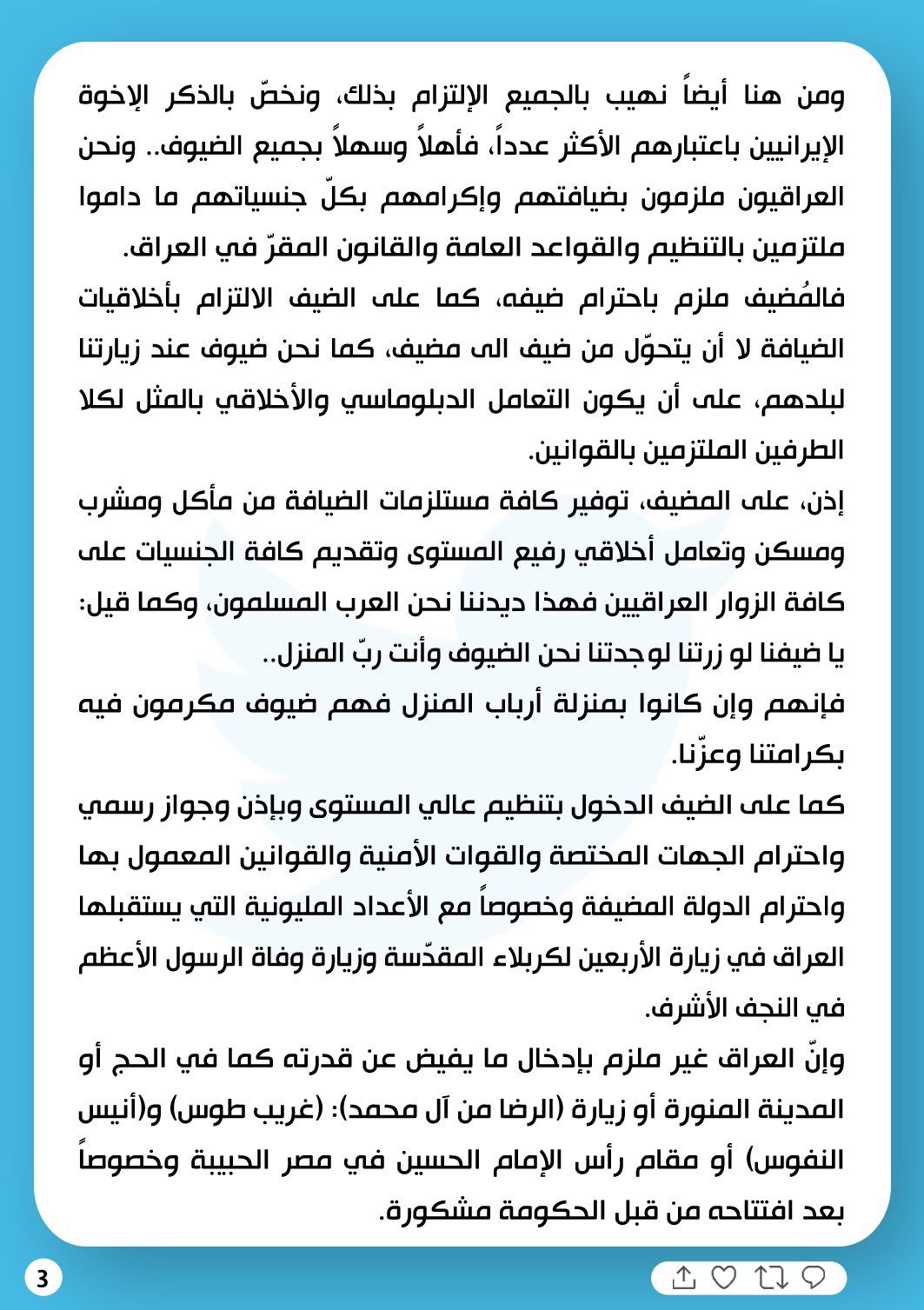 بغداد/ شبكة أخبار العراق- طالب الصدر حكومة الكاظمي بتفتيش الزوار الإيرانيين ووضع ضوابط  قانونية وصحية لدخولهم للعراق وإبعاد ميليشيا الحشد الشعبي من توفير الحماية لهم وتكون المسؤولية من قبل وزارة الداخلية حصرا وكفى فوضى ، وليكن تعامل العراق مثل باقي دول العالم المحترمة في دخول الزائرين  وغيرهم.