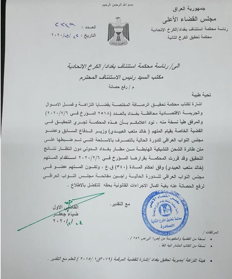 بغداد/شبكة أخبار العراق- طالبت محكمة تحقيق الرصافة المختصة بقضايا النزاهة وغسل الأموال والجريمة الاقتصادية، برفع الحصانة عن وزير الدفاع الأسبق والنائب الحالي، خالد العبيدي، للتحقيق معه حول تصرفه بالأسلحة التي كانت على متن طائرة الشحن التشيكية التي هبطت في مطار بغداد الدولي أبان فترة توليه منصب وزير الدفاع.ونصت وثيقة حصلت عليها (شبكة أخبار العراق)، أن محكمة تحقيق الرصافة المختصة بالنزاهة، تجري التحقيق مع العبيدي، حول تصرفه بالأسلحة التي كانت على متن الطائرة التشيكية التي هبطت في مطار بغداد الدولي، أبان فترة توليه منصب وزير الدفاع، دون انتظار نتائج التحقيق، ولكون المتهم عضو حالي في مجلس النواب، طالبت المحكمة برفع الحصانة عنه.
