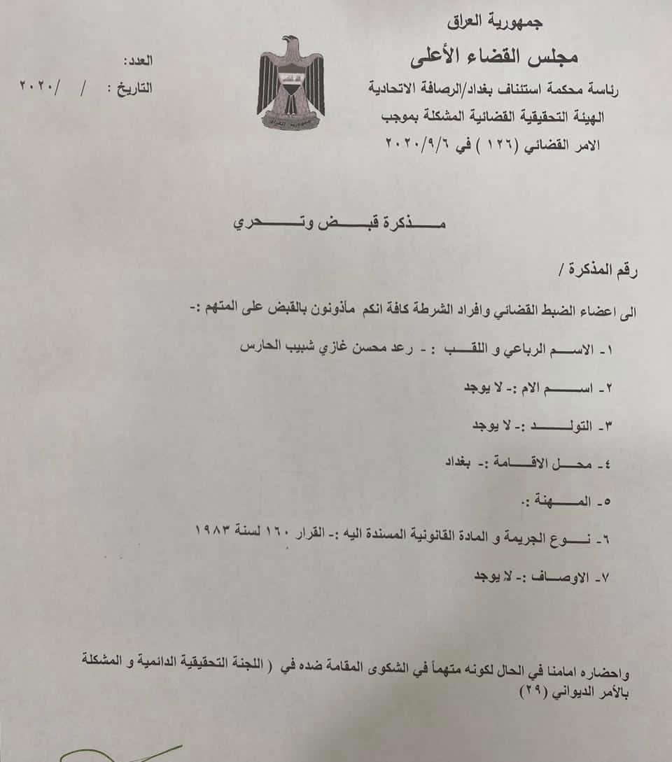 بغداد/شبكة أخبار العراق- اعتقلت قوة أمنية، الثلاثاء، مستشار رئيس الوزراء، والوكيل الأقدم السابق، لوزارة الكهرباء، رعد الحارس. ويأتي ذلك عقب صدور مذكرة قبض من القضاء.وذكرت وثيقة صادرة من مجلس القضاء الأعلى، (3 تشرين الثاني 2020)، إنه “جاءت مذكرة القبض بحق رعد محسن غازي شبيب الحارس، بناء على شكوى مقدمة ضده في اللجنة التحقيقية الدائمية والمشكلة بالأمر الديواني 29”. وأفاد مصدر ، بأنه “تم تنفيذ مذكرة القبض الصادرة بحق الحارس، وتم اعتقاله”. وينص القرار 160، الصادر، في 5/2/1983 على ما يلي: